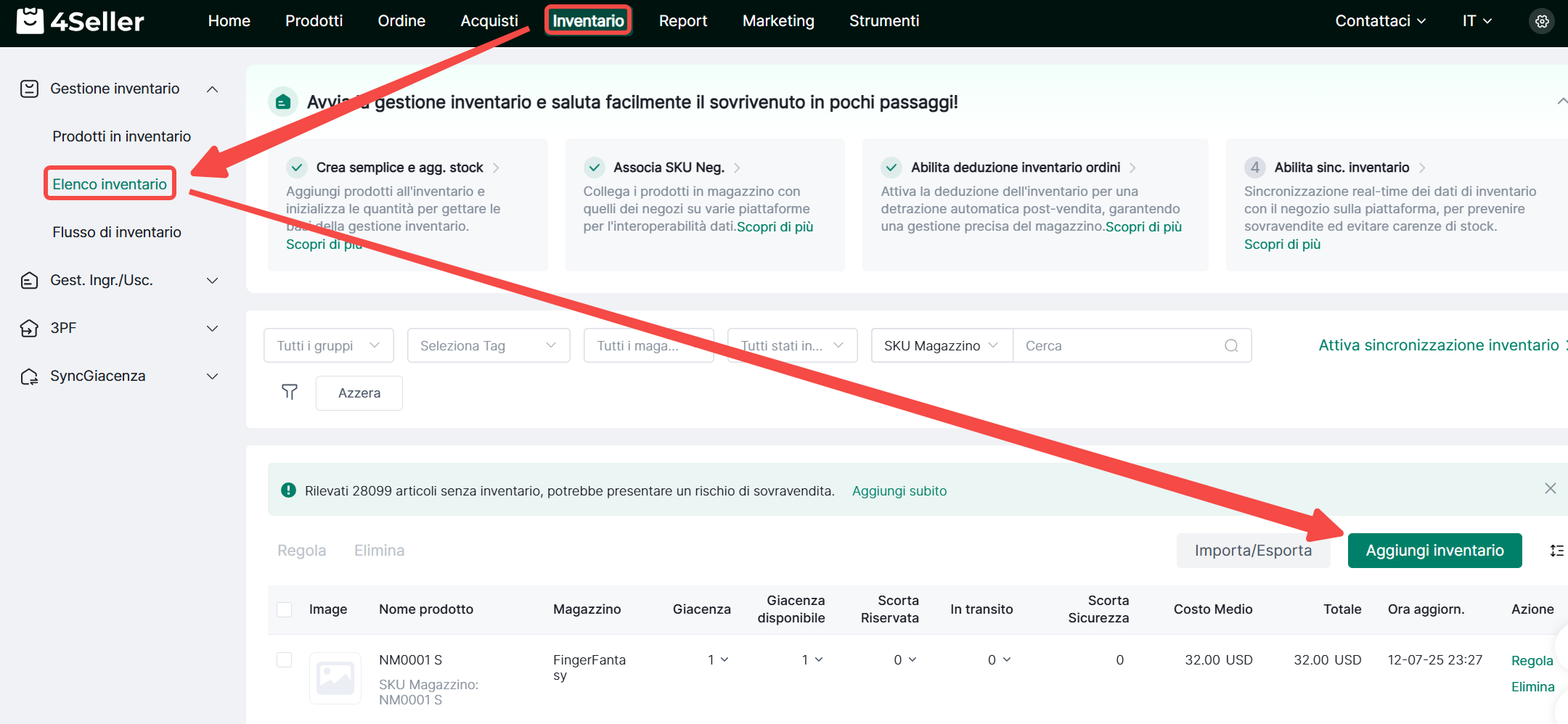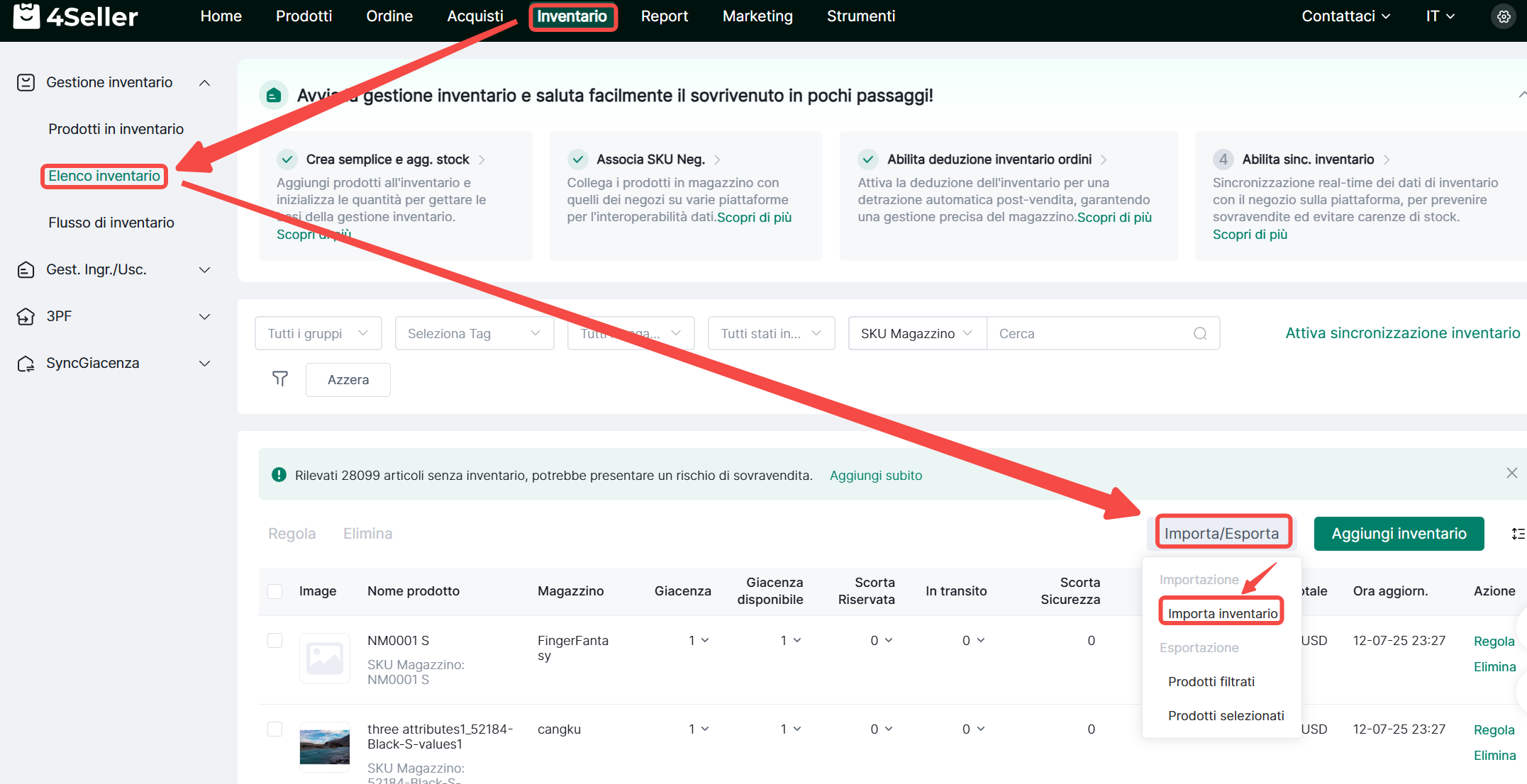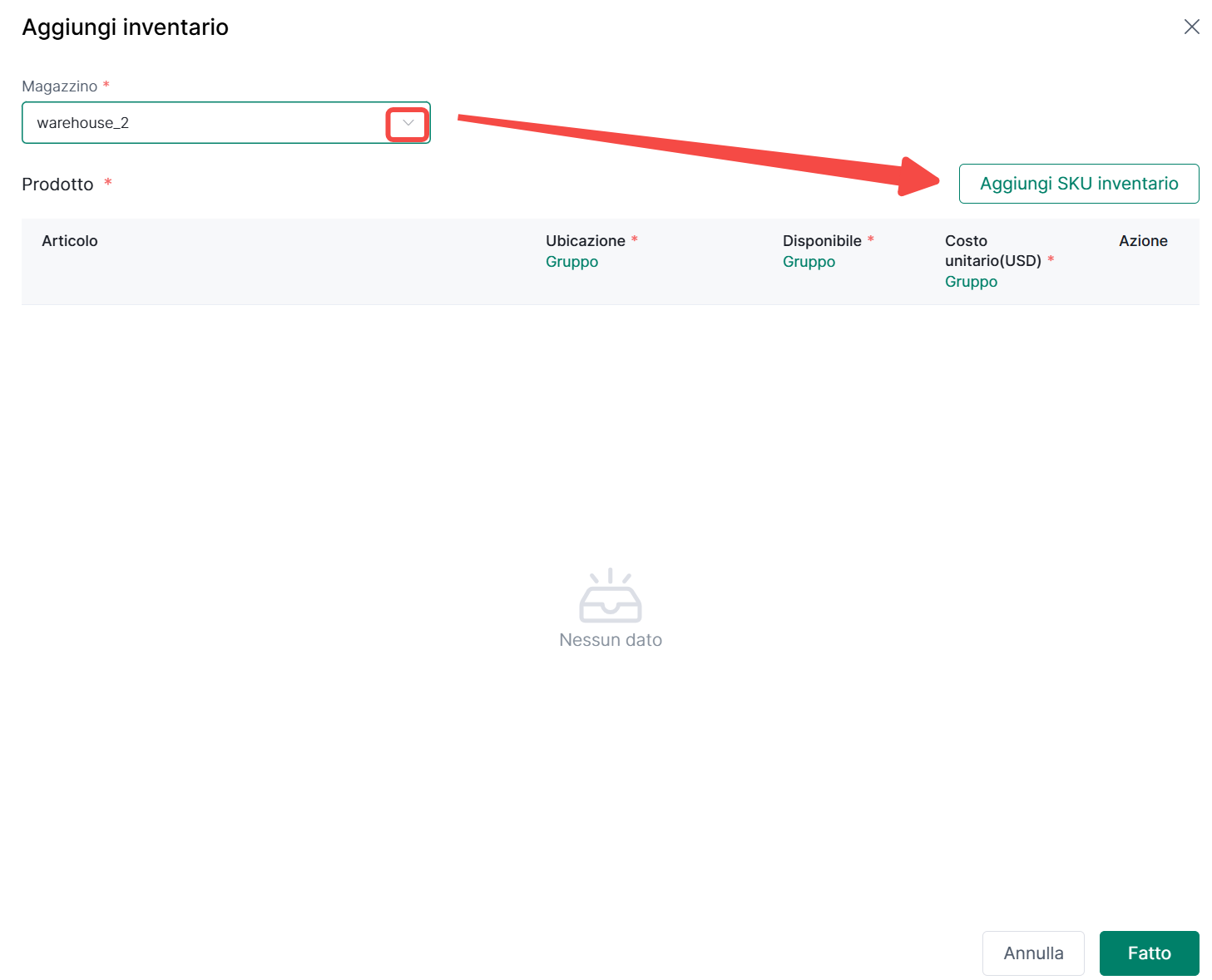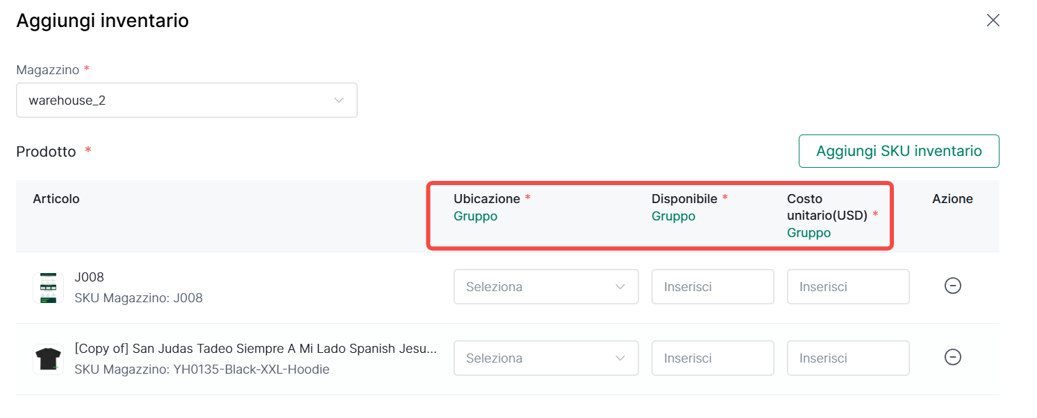 Nota: Quando aggiungi inventario, assicurati che lo SKU di inventario esista nel prodotto di magazzino. Altrimenti, aggiungi prima i prodotti di inventario prima di aggiungere l'inventario prodotto.