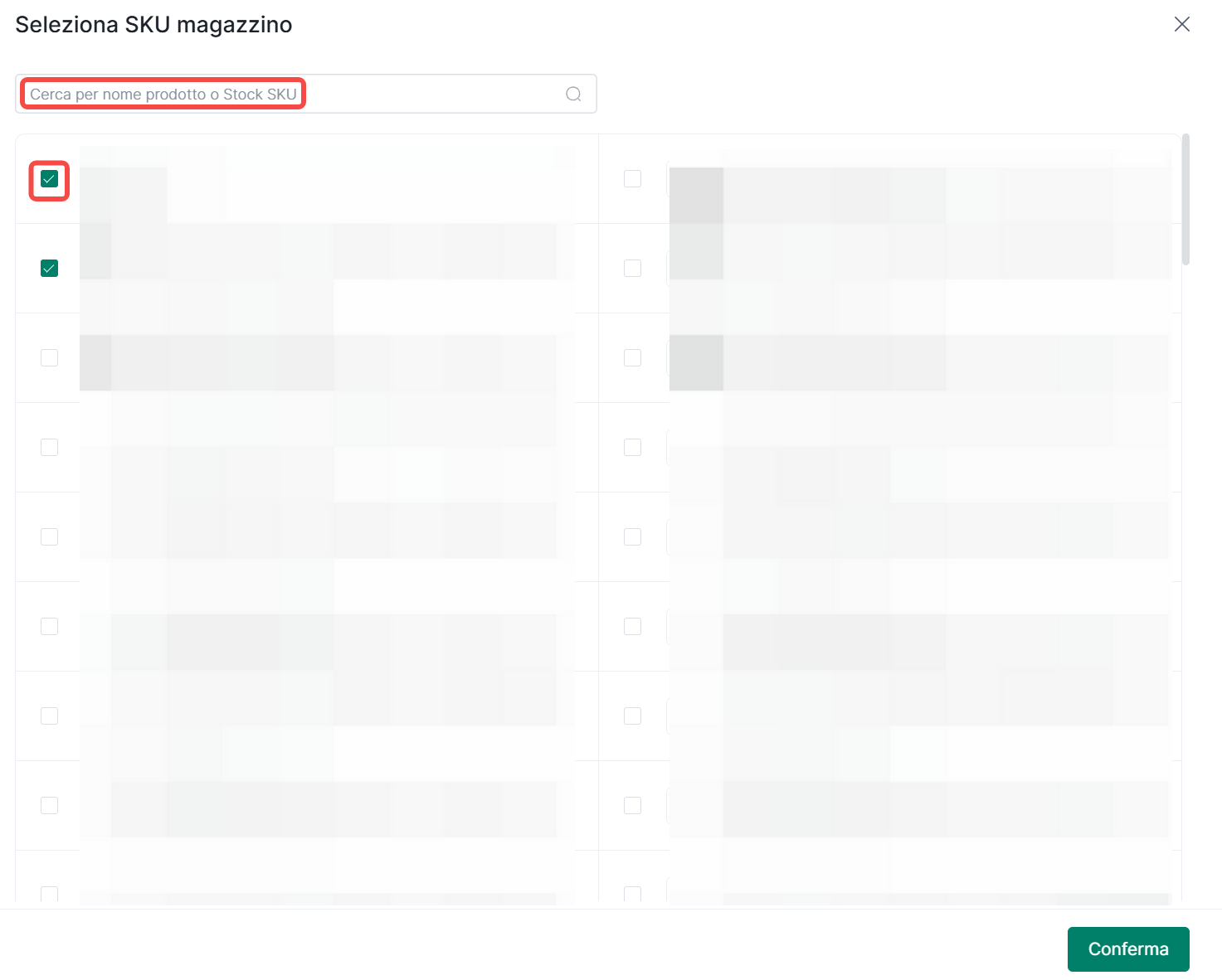 3. Nella pagina Seleziona SKU, cerca per nome prodotto o Stock SKU. Seleziona gli SKU di inventario da aggiungere, poi clicca Conferma per aggiungerli