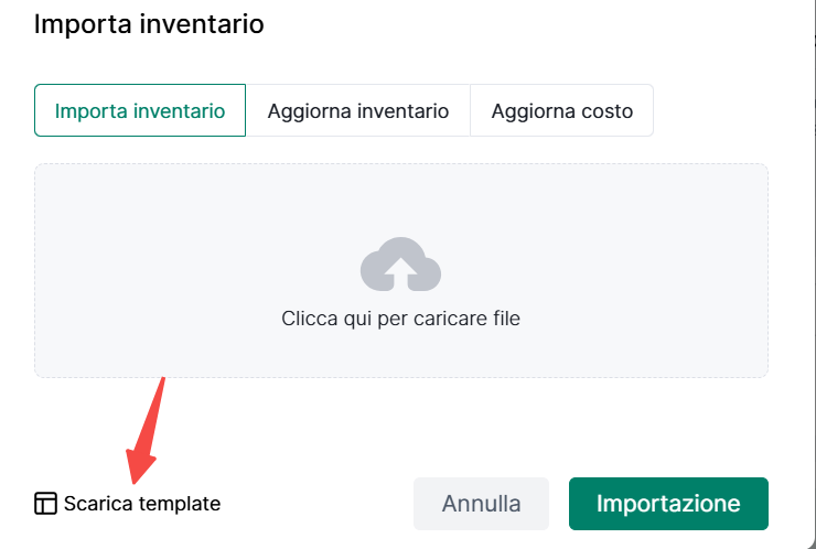 2. Per importare inventario, scarica prima il template. Dopo aver compilato le informazioni, caricalo e clicca Importa per importare massivamente l'inventario.