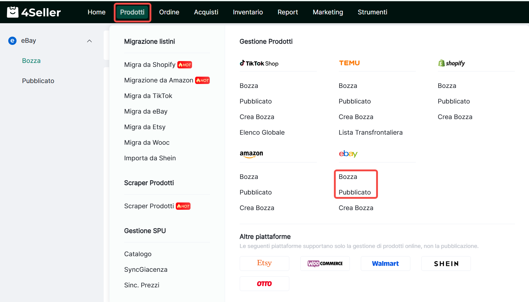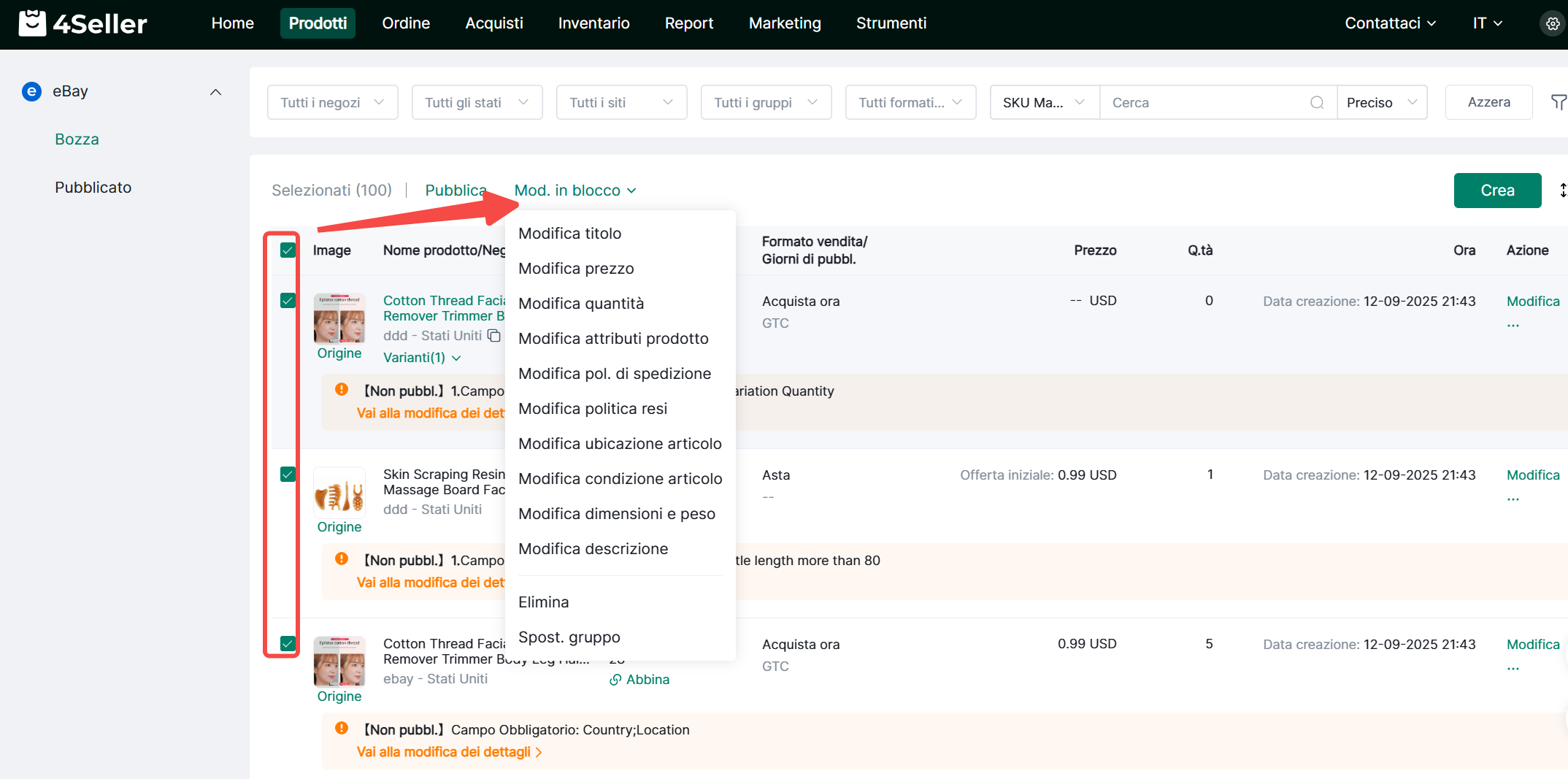 Nelle pagine Bozze o Pubblicati, filtra i prodotti che richiedono operazioni in blocco, selezionali, quindi clicca Azioni in Blocco. Scegli gli attributi da modificare per aggiornamenti in massa.