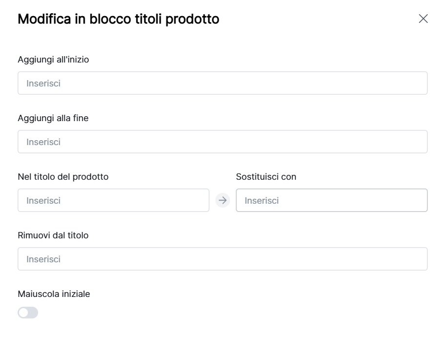 1. Modifica in blocco dei titoli prodotti: Supporta l'aggiunta, sostituzione o rimozione di testo all'inizio/fine. Clicca Conferma.