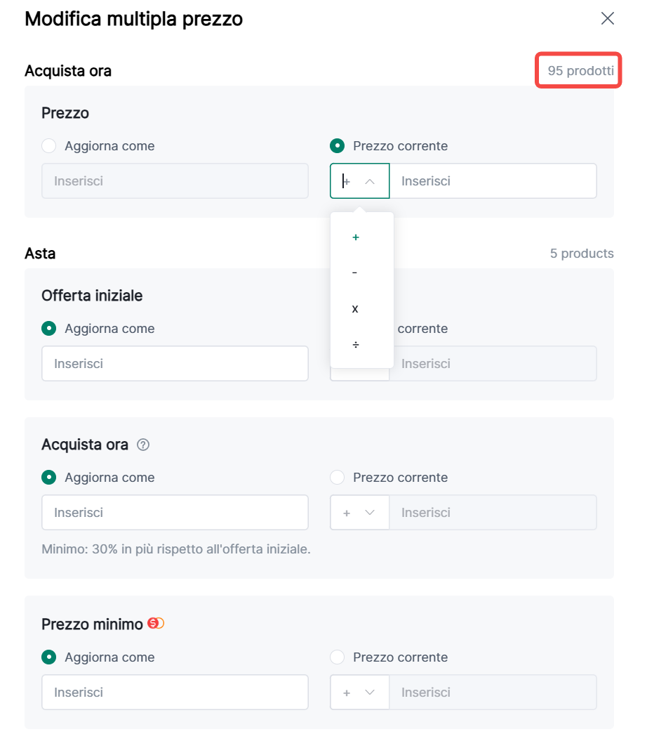 (4) Per aste con sia 'Aggiorna come' offerta iniziale che prezzo Acquista Subito impostati, il prezzo Acquista Subito deve essere ≥ 1.3 volte l'offerta iniziale;
