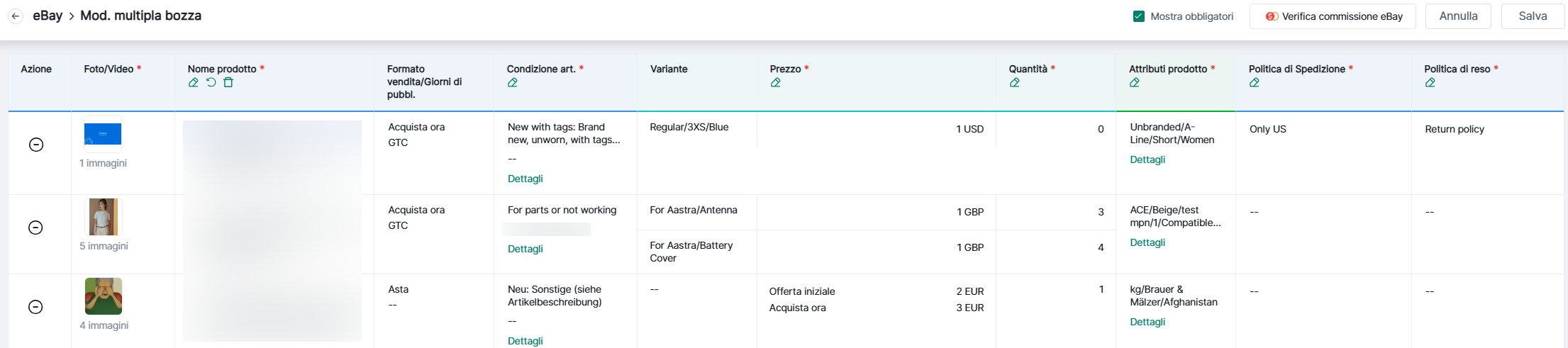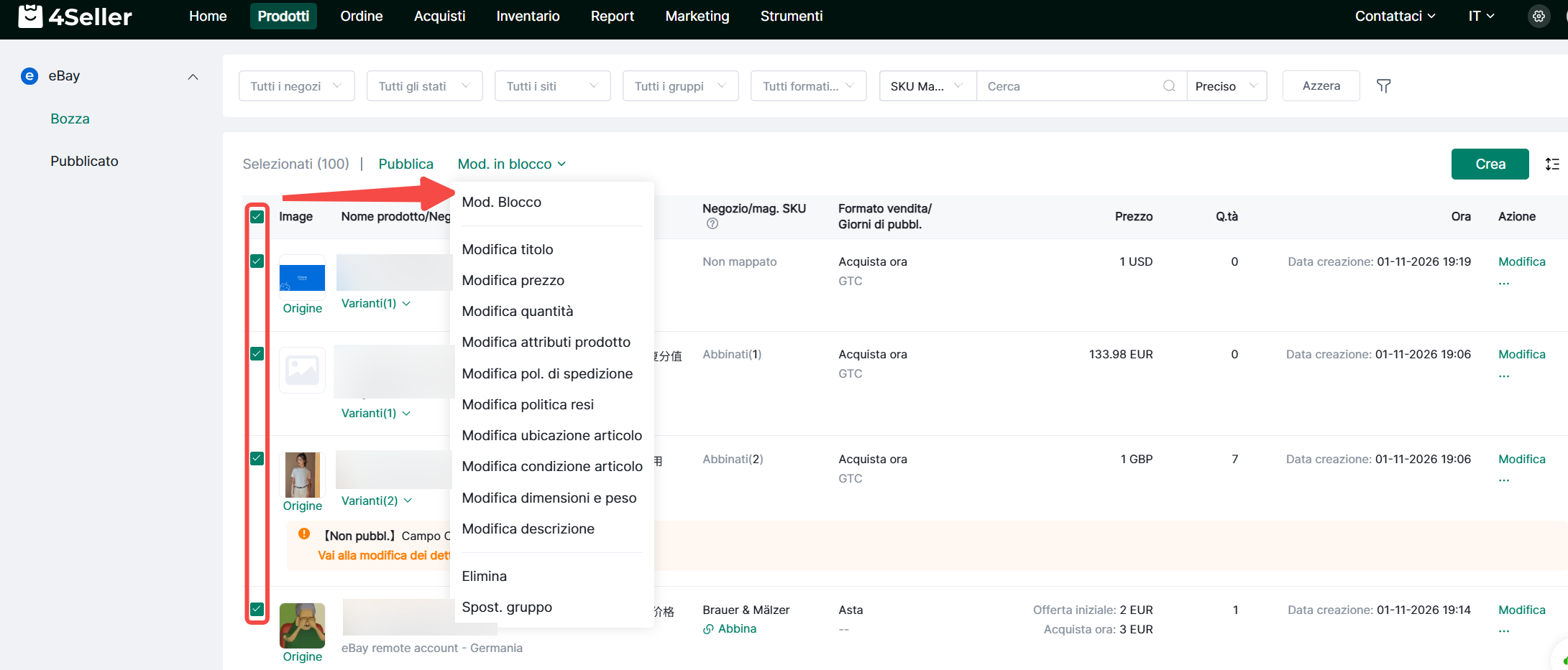 4Seller supporta la modifica in blocco degli attributisu più prodotti per migliorare l'efficienza delle inserzioni su eBay.