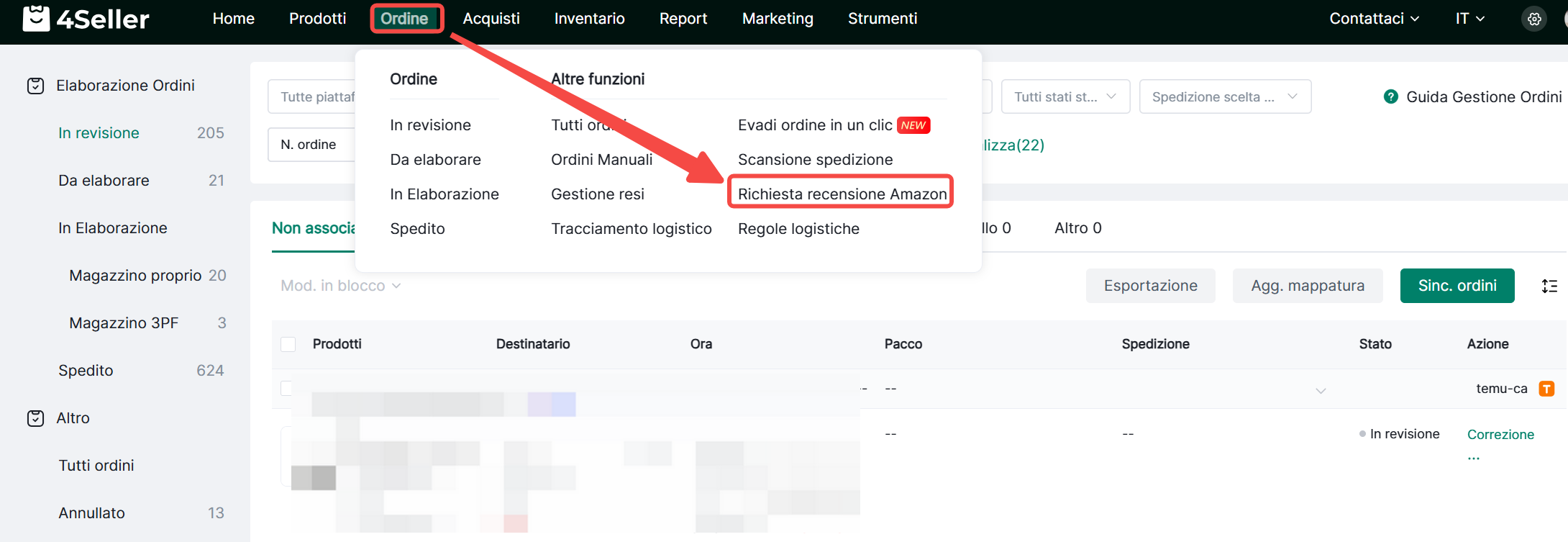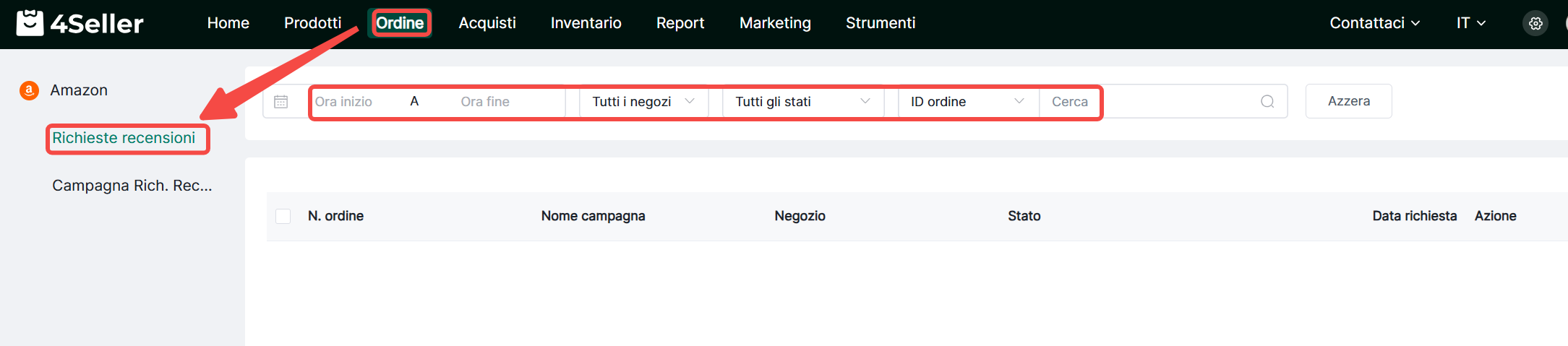 1. Accesso: Clicca Ordini> Richiesta Recensioni Amazon