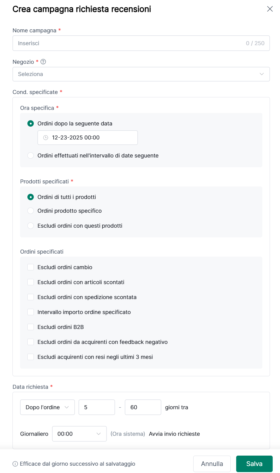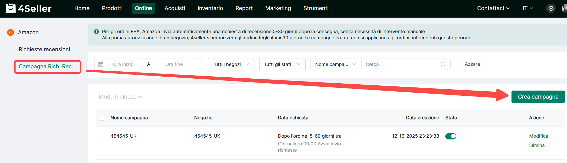 (1) Questa funzionalità si applica solo agli ordini FBM. Per gli ordini FBA, Amazon invia automaticamente le richieste di recensione entro 5-30 giorni dalla consegna, eliminando le richieste manuali.