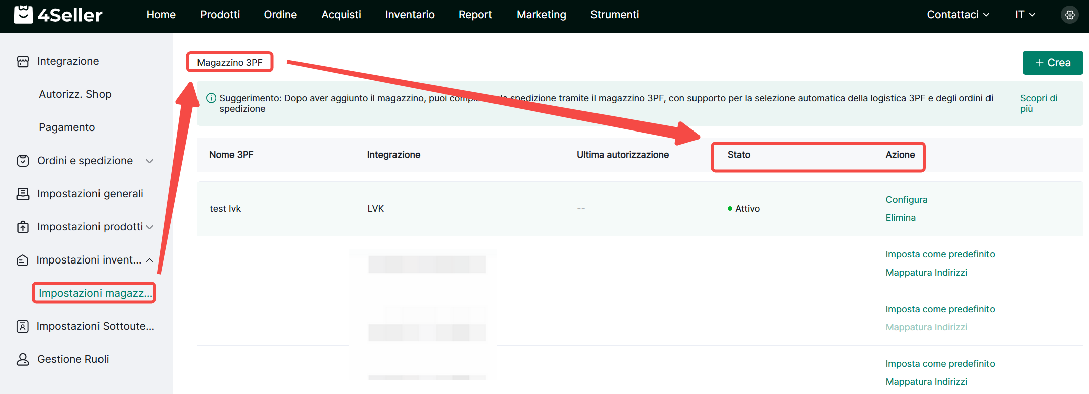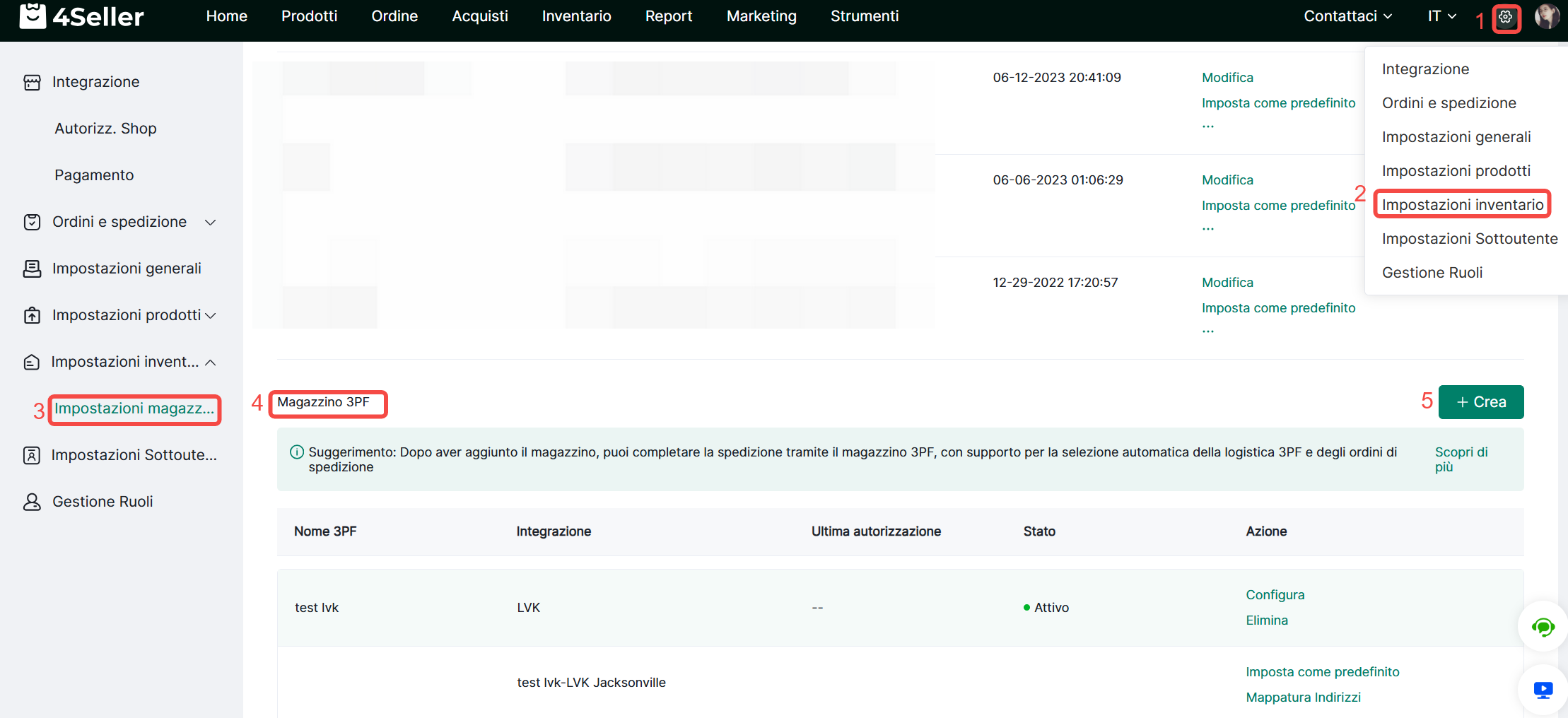 1. Clicca Impostazioni > Impostazioni Inventario > Impostazioni Magazzino > Magazzino 3PF > Crea.