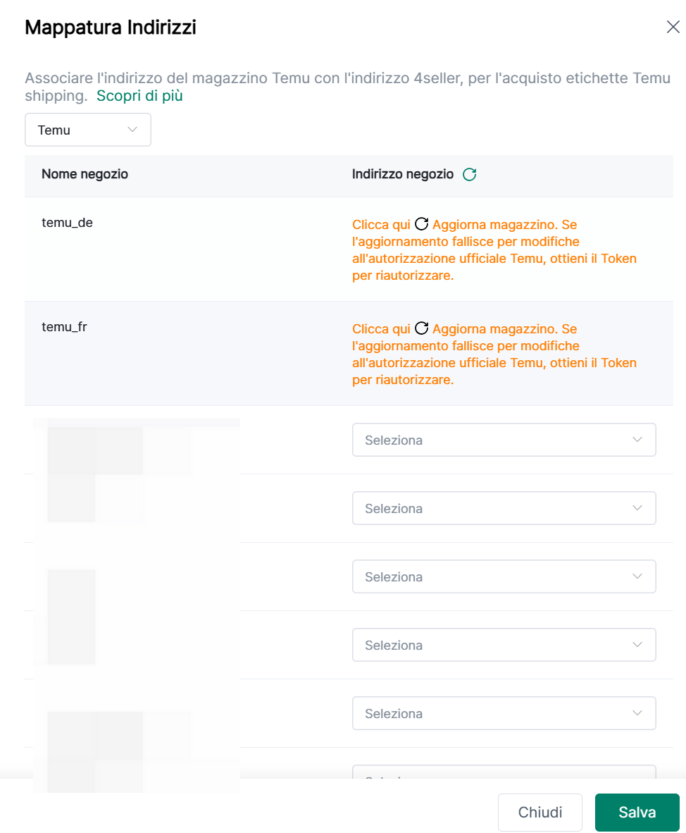 5. L'abbinamento indirizzi collega l'indirizzo del magazzino del tuo store Temu con il tuo indirizzo 4Seller per acquistare etichette di spedizione tramite Temu Shipping.