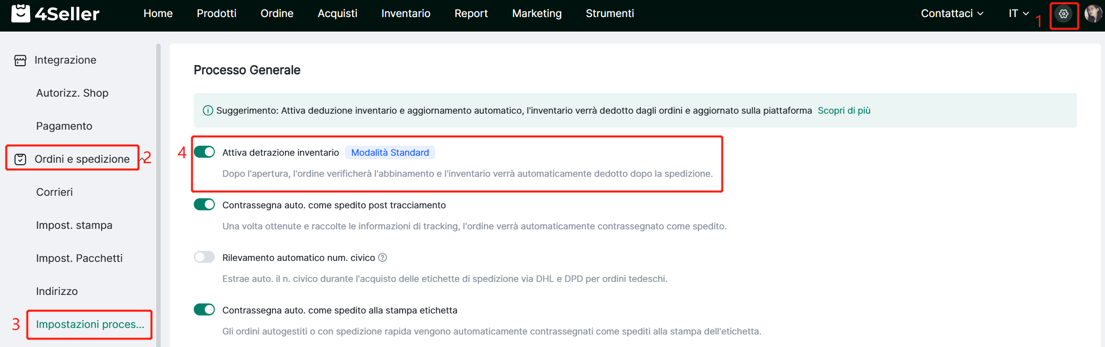 1. Dovresti aprire "Attiva detrazione inventario".
