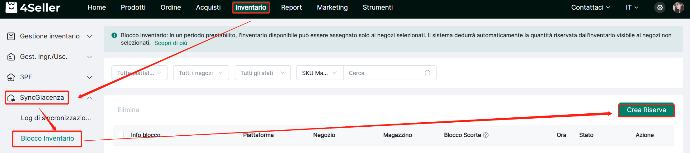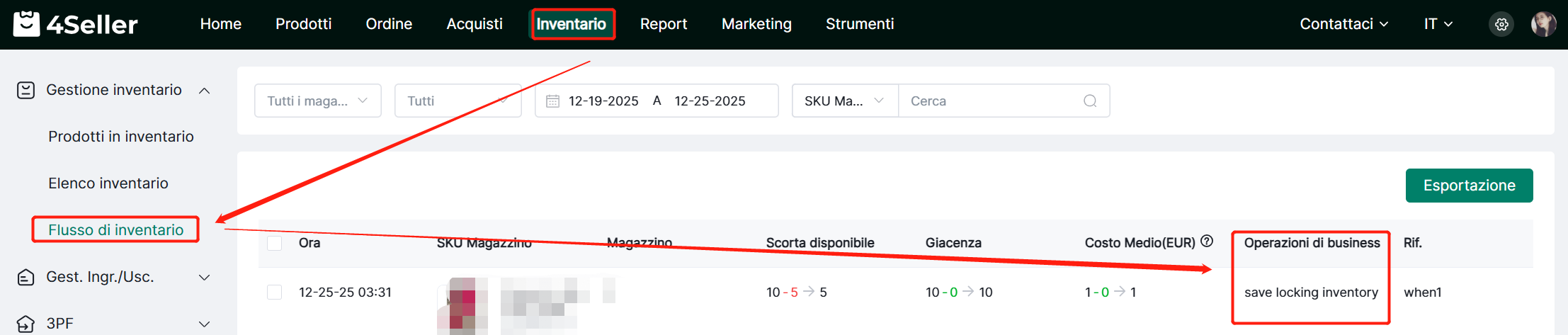 Nota: L'inventario bloccato viene riservato in anticipo, e il corrispondente inventario bloccato verrà detratto dallo SKU corrispondente del negozio in base all'orario di creazione.