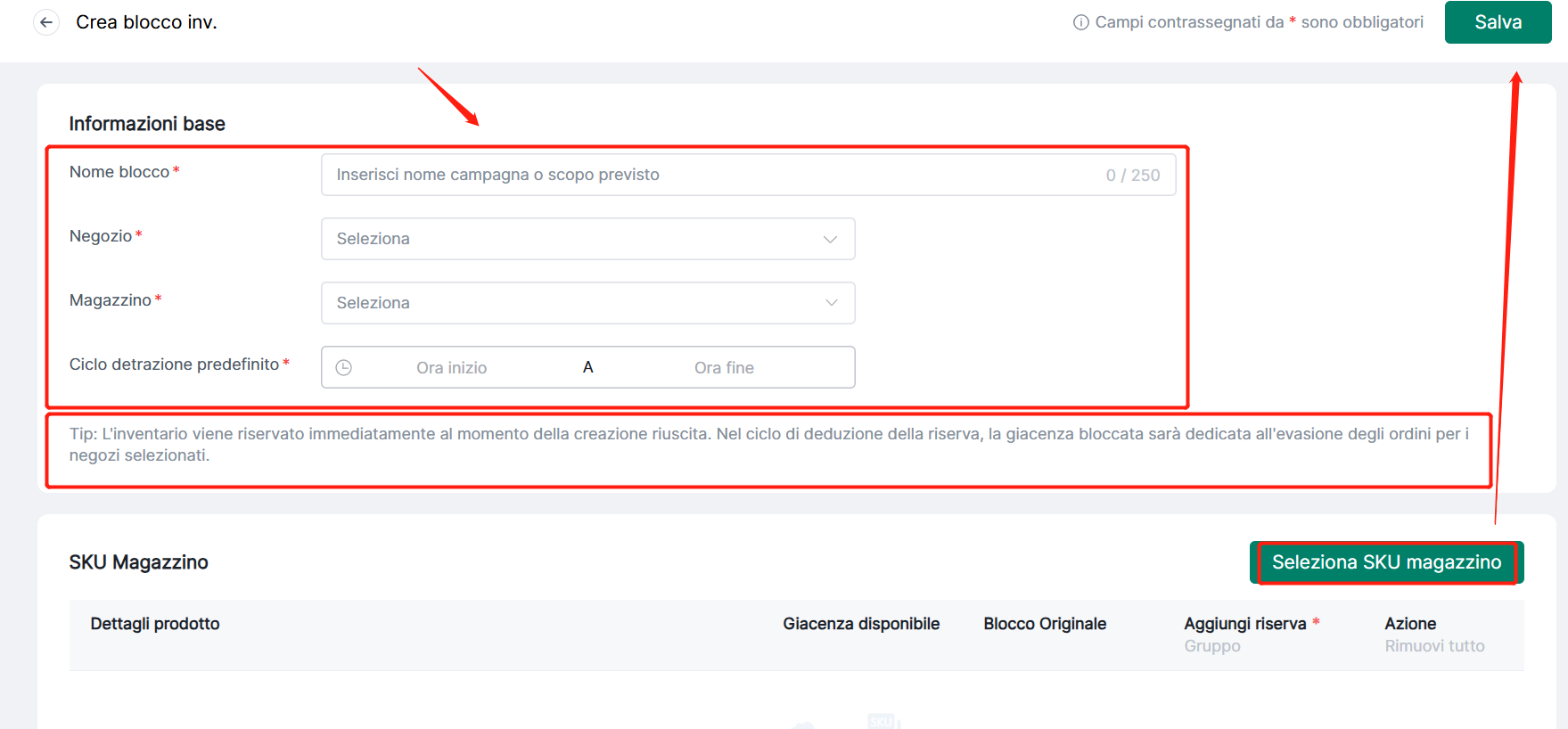 Step 2: Compila le informazioni blocco inventario: Nome blocco, Negozio, Magazzino, Ciclo detrazione, seleziona SKU magazzino, poi clicca salva.