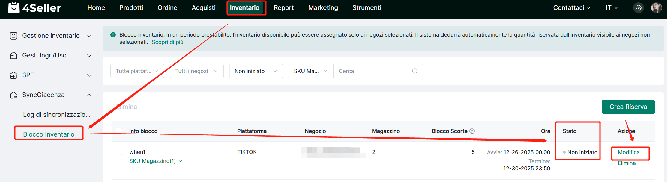 4Seller supporta il blocco dell'inventario, che ha lo scopo di aiutare i venditori a riservare parte del loro inventario per canali specifici, come le attività di promozione dello shop TikTok, per garantire un inventario sufficiente.