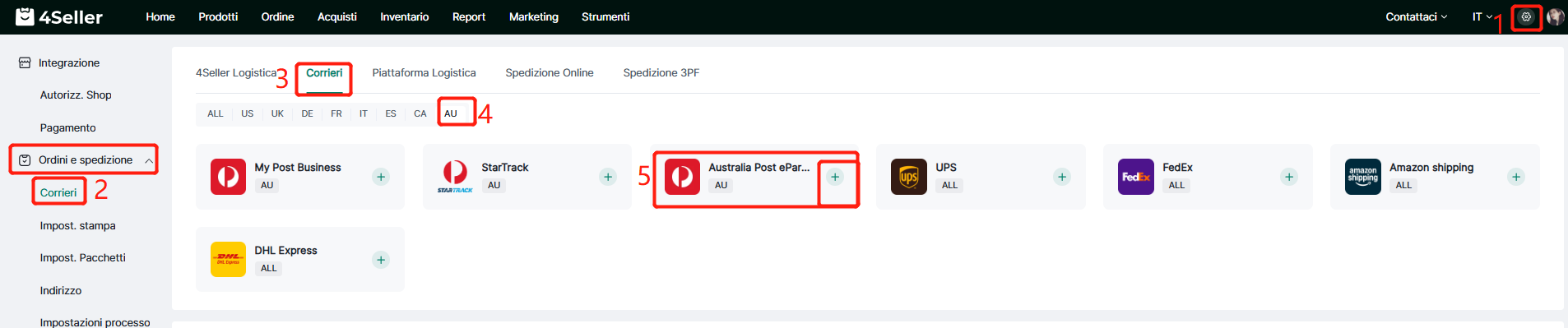 Passo 1: Impostazioni--Ordini & Spedizioni--Corrieri--Corrieri--AU