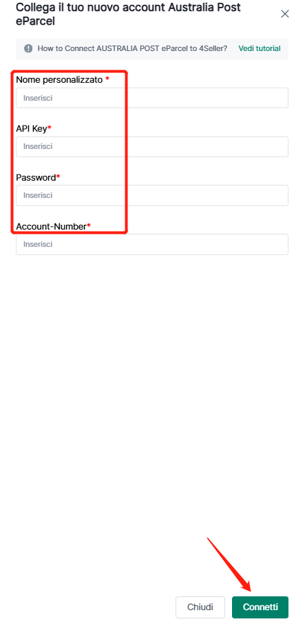 Compila i campi della finestra pop-up con le informazioni richieste e clicca Connetti.