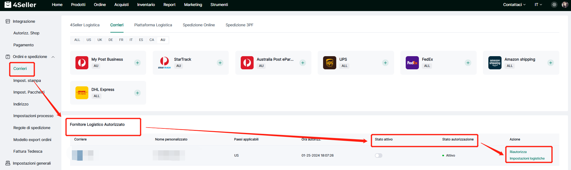 Passo 3: Dopo l'autorizzazione completata, potrai visualizzare il fornitore logistico autorizzato qui sotto, con opzioni per attivare/disattivare, riautorizzare e impostare i canali logistici.