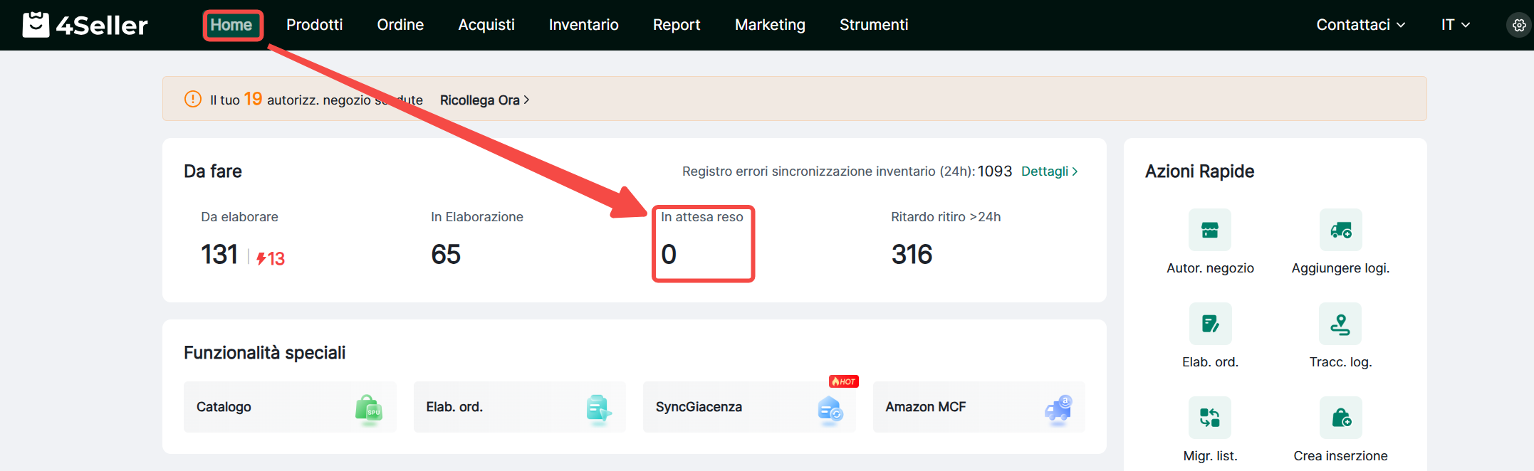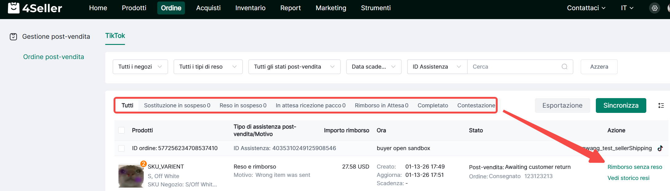 2. Gli ordini con diversi tipi di reso/rimborso verranno categorizzati e visualizzati di seguito. Clicca sui prompt azione pertinenti per procedere.