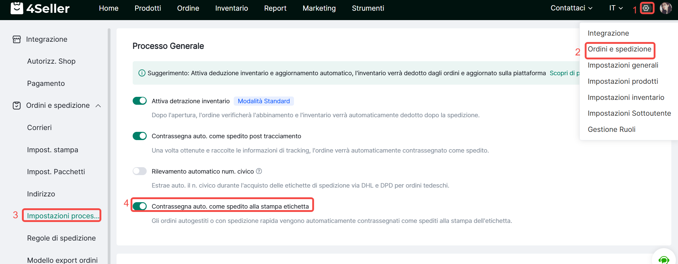4Seller supporta la marcatura automatica come spedito. Per ordini auto-gestiti o a spedizione rapida, l'ordine verrà automaticamente contrassegnato come spedito dopo la stampa dell'etichetta di spedizione, eliminando la necessità di marcare manualmente nuovamente l'ordine come spedito.