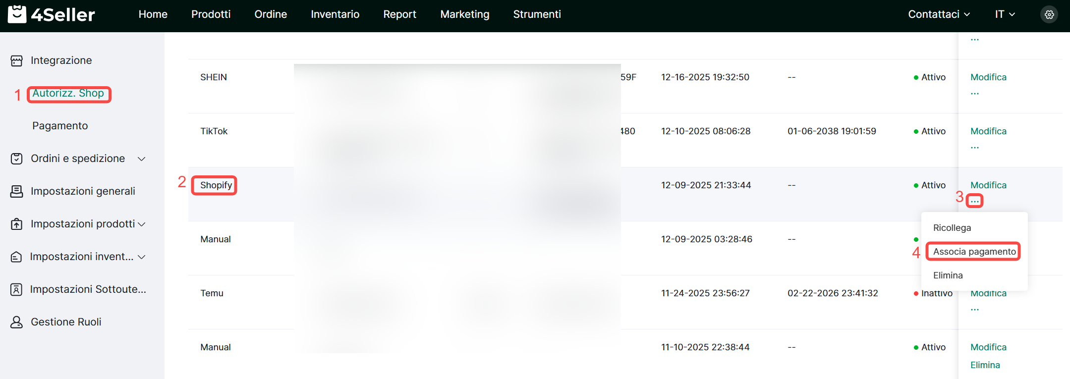 Passo 2: Impostazioni--Integrazioni--Shop--I miei negozi--Seleziona Shopify per Associare pagamento