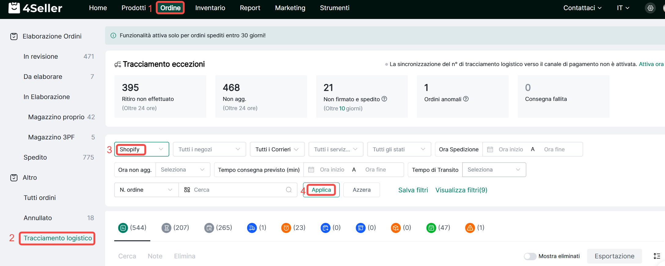 Passo 4: Ordini --Tracciamento Logistico--Filtra Shopify--Controlla lo stato associazione