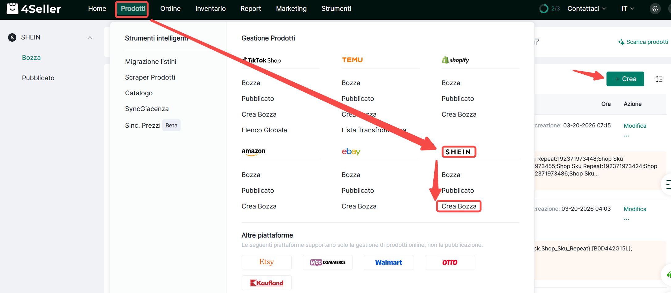 1. Clicca Prodotti > SHEIN > Bozze > Crea Bozza, oppure clicca Crea dopo aver inserito la pagina prodotto.