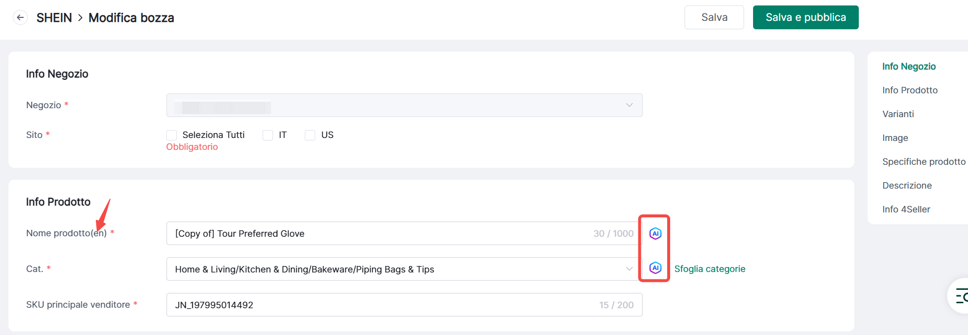 (1) Informazioni Negozio: Usa il menu a tendina per selezionare il negozio dove vuoi pubblicare i prodotti. Dopo la selezione, verranno visualizzati i siti sotto quel negozio; seleziona i siti corrispondenti.