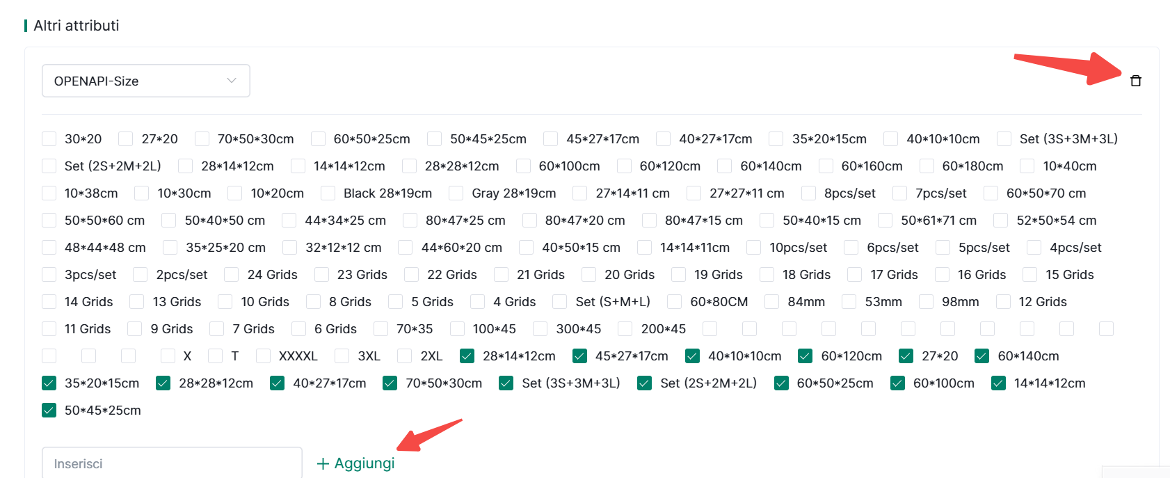② Altre Specifiche: Gli elementi contrassegnati in rosso sono attributi obbligatori. Puoi aggiungere attributi personalizzati o eliminarli secondo necessità.