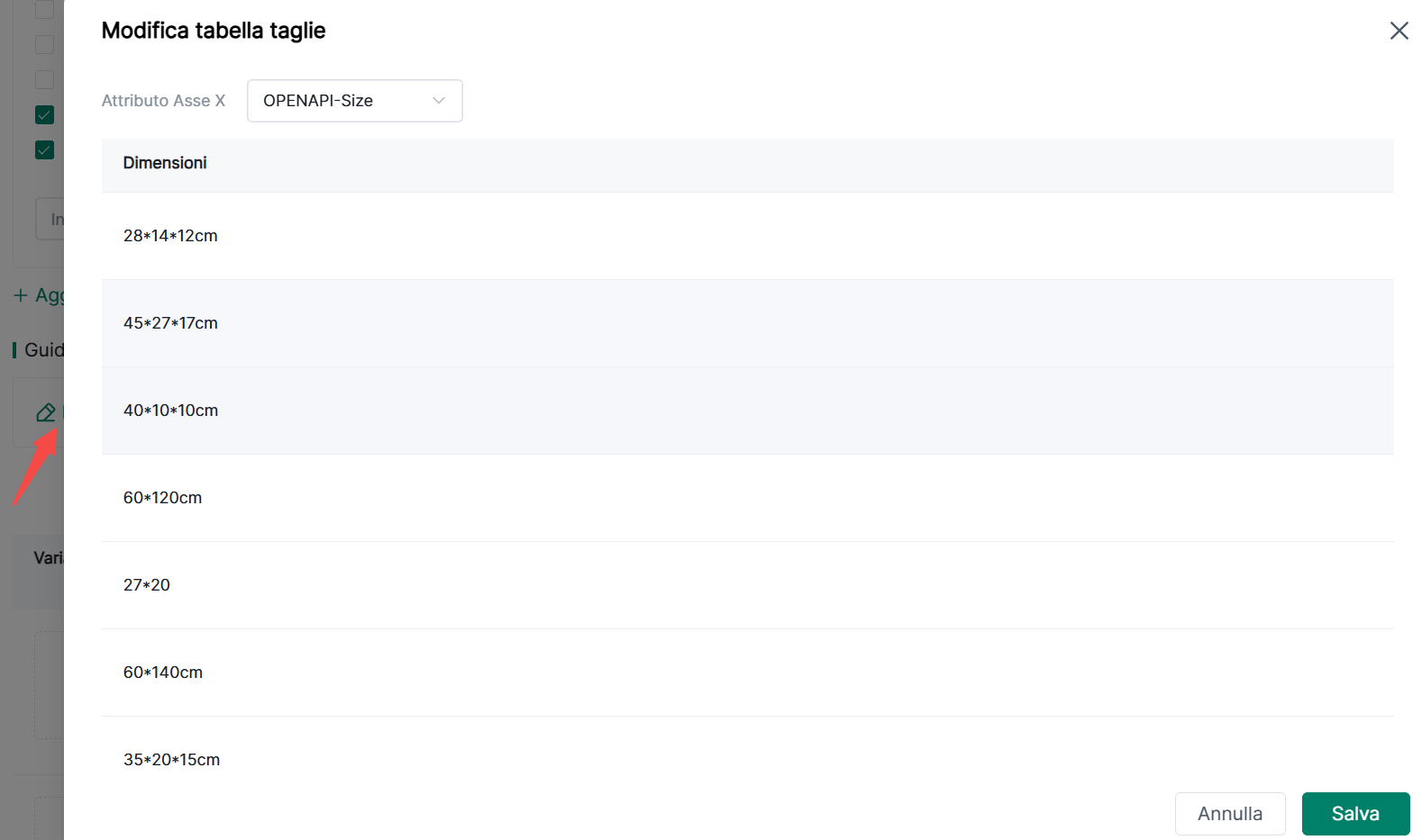 ③ Tabella Taglie: Clicca il pulsante "Modifica" per inserire le informazioni taglie.