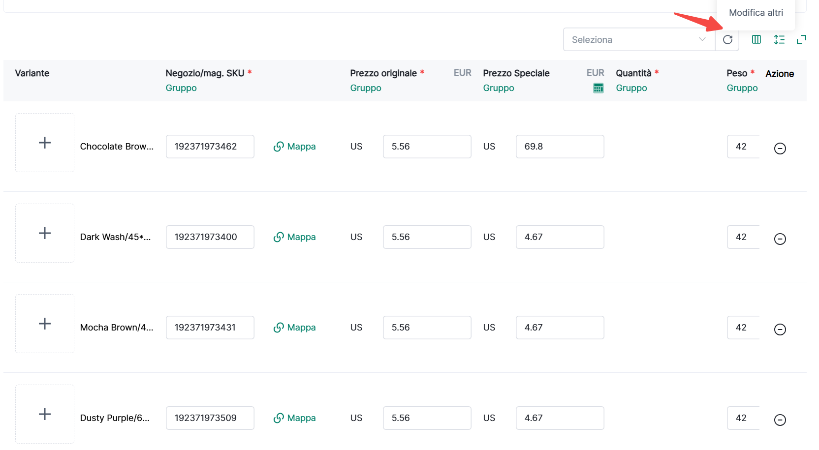 ④ Varianti: Genera varianti in base agli attributi varianti selezionati. Clicca "Aggiorna Magazzino" per compilare le informazioni rilevanti; puoi anche cliccare "Modifica Schermo Intero" o usare l'elaborazione batch. Clicca "Abbina SKU Inventario"