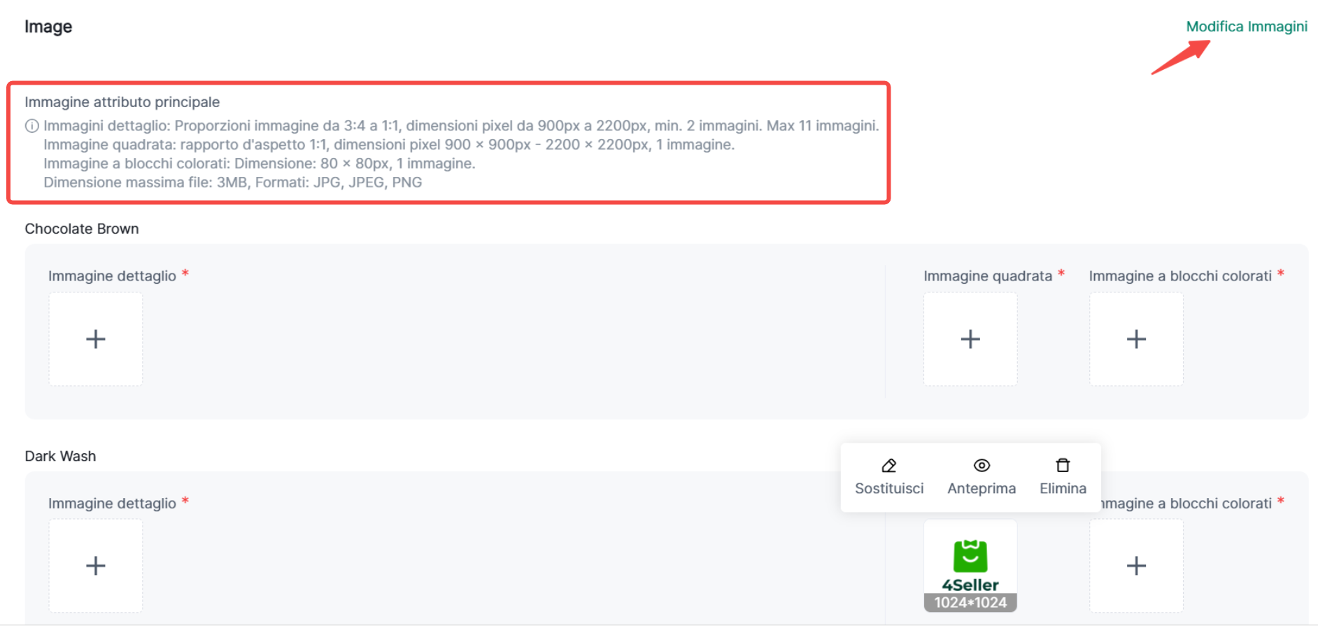 ⑤ Immagini: Gli elementi contrassegnati in rosso sono immagini obbligatorie. Se il numero di attributi per la specifica principale è ≥2, deve essere fornita un'immagine campione colore. Diverse immagini devono essere compilate secondo i requisiti pertinenti. Clicca "Modifica Immagini" per regolare le dimensioni delle immagini in batch.