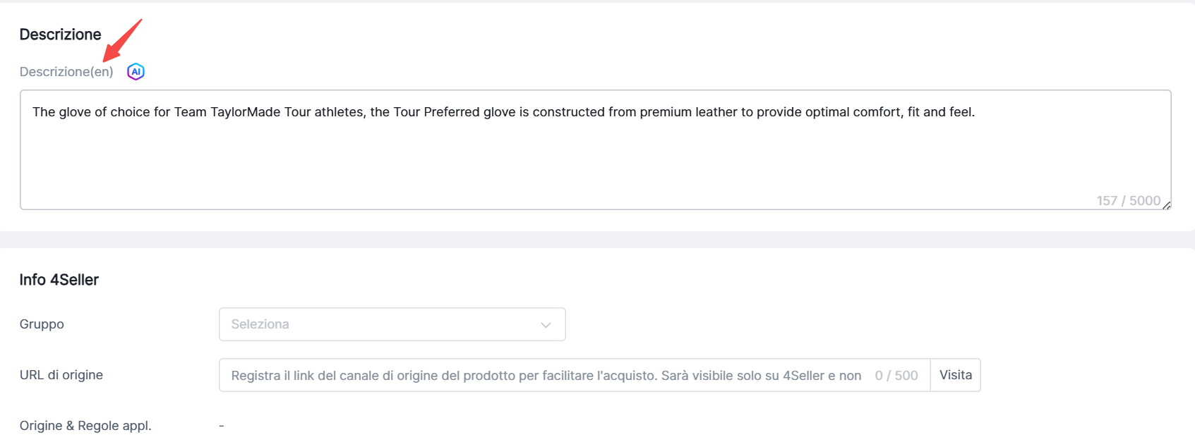 (5) Descrizione: Clicca per generare una descrizione usando l'AI; compila la lingua corrispondente tra parentesi.