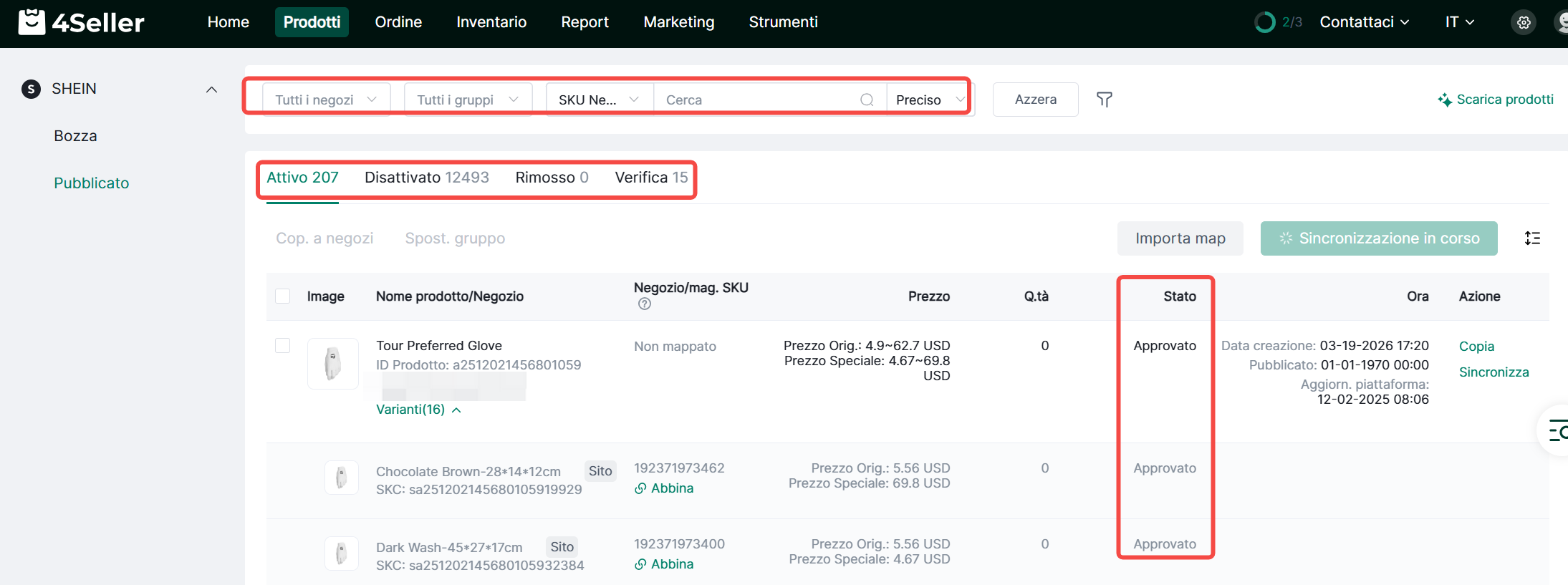 (2) Dopo la pubblicazione riuscita, il prodotto apparirà nella lista Pubblicati. Clicca "Varianti" per espandere e visualizzare lo stato di pubblicazione di ogni variante. Clicca 'Copia' per copiare le informazioni prodotto nella sezione Bozze, o clicca "Sincronizza" per aggiornare le informazioni piattaforma nella pagina elenco.