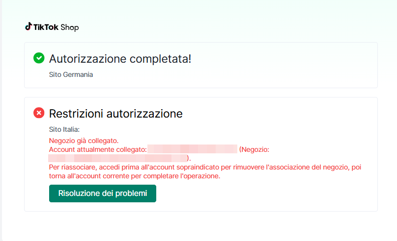 In 4Seller, lo stesso store non può essere autorizzato su più account contemporaneamente. Esempio TikTok: durante l'autorizzazione, viene visualizzato l'errore: