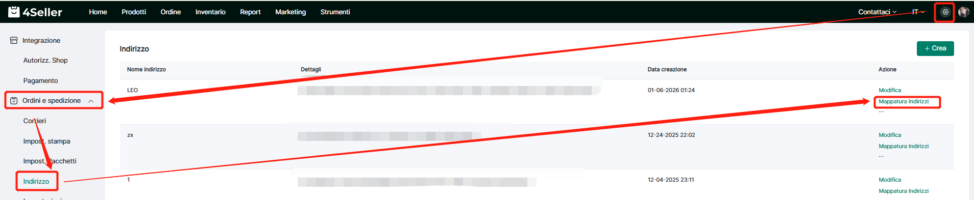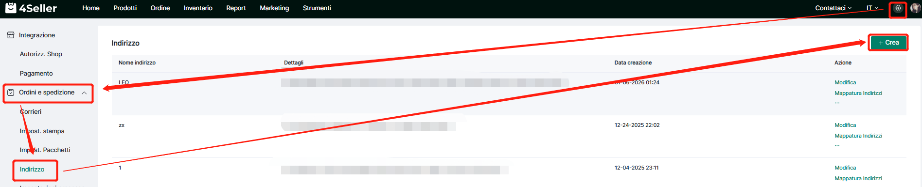 Accedi a 4Seller, clicca su Impostazioni - Ordini e spedizione - Indirizzo, accedi alla pagina di impostazione dell'indirizzo, se non hai un indirizzo, puoi configurarlo, clicca su "Crea"