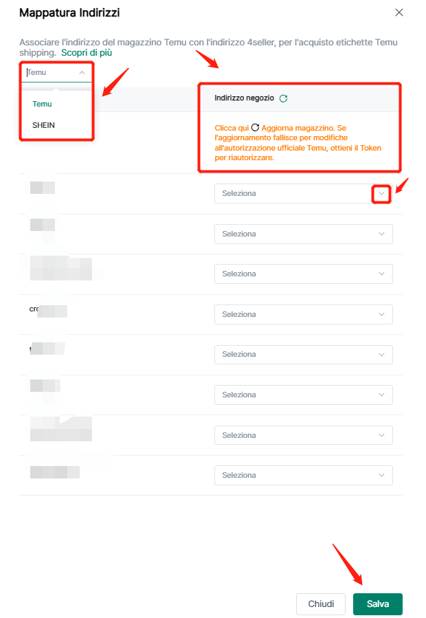 Dopo aver cliccato su "Mappatura indirizzi", apparirà una pagina pop-up per la mappatura degli indirizzi. Puoi cliccare sul pulsante "Aggiorna" per aggiornare l'indirizzo del negozio sulla piattaforma Temu & Shein, selezionare l'indirizzo corrispondente dal menu a tendina e cliccare su "Salva" per completare la mappatura.