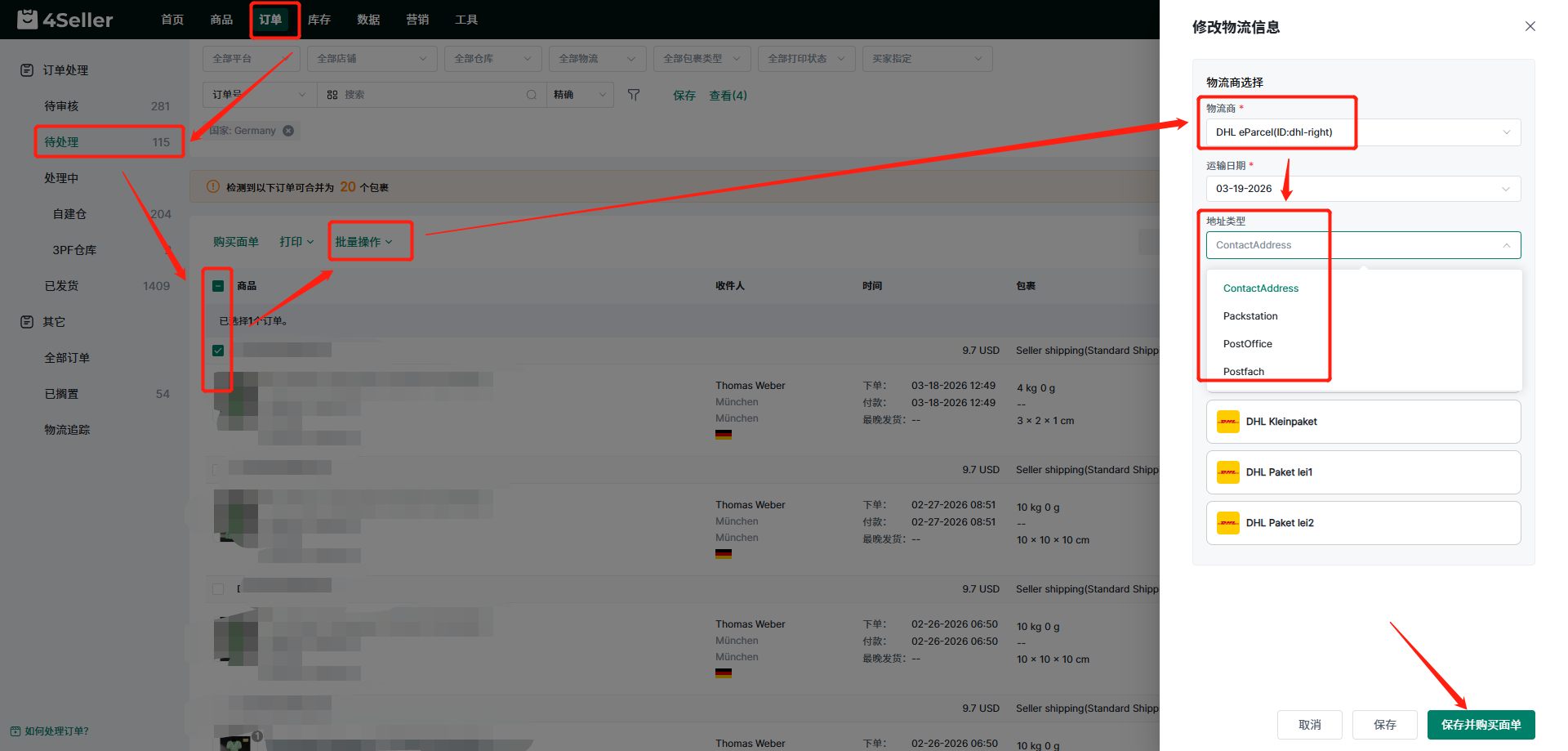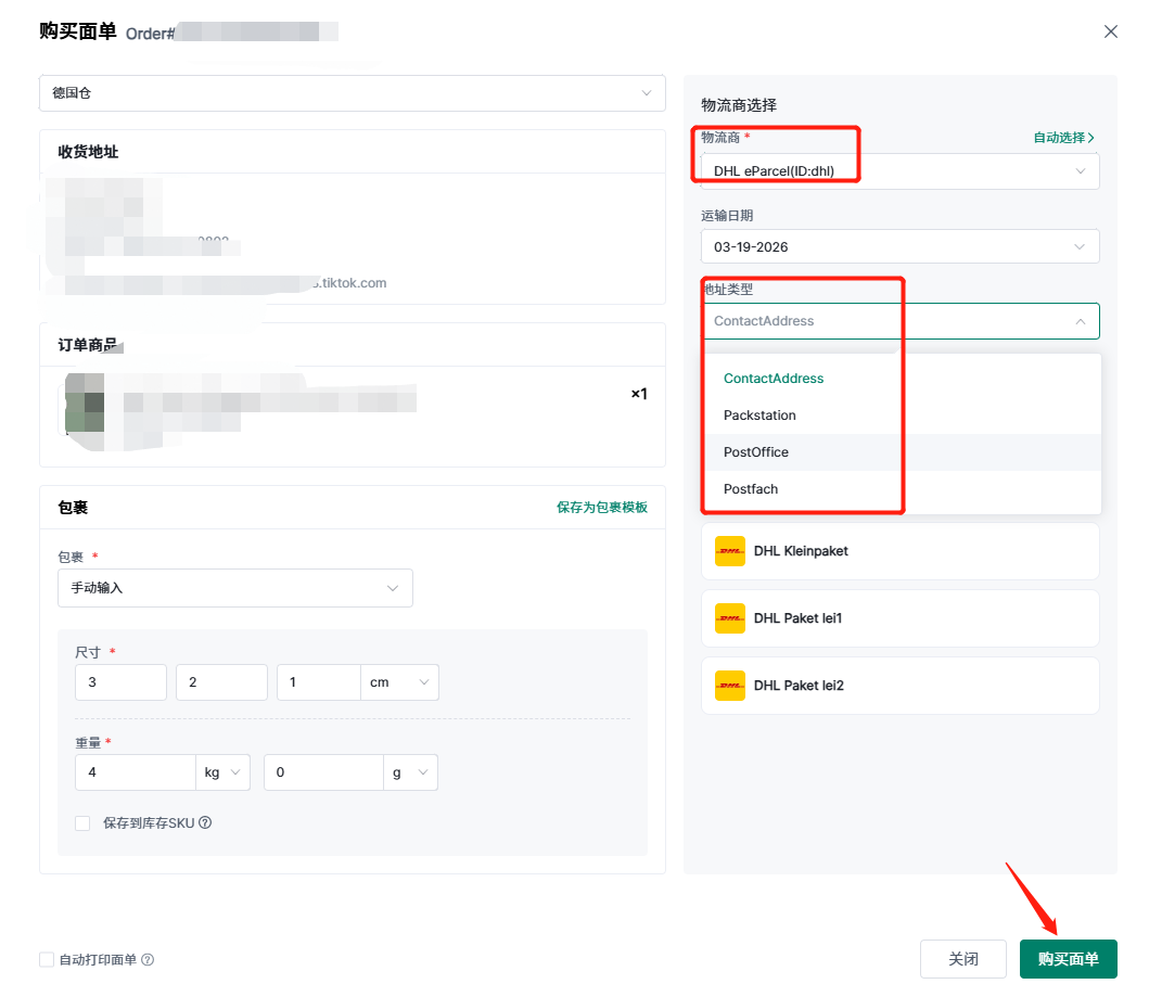 步骤三:单个购买面单:订单--选择DHL eParcel--支持选择地址类型--购买面单