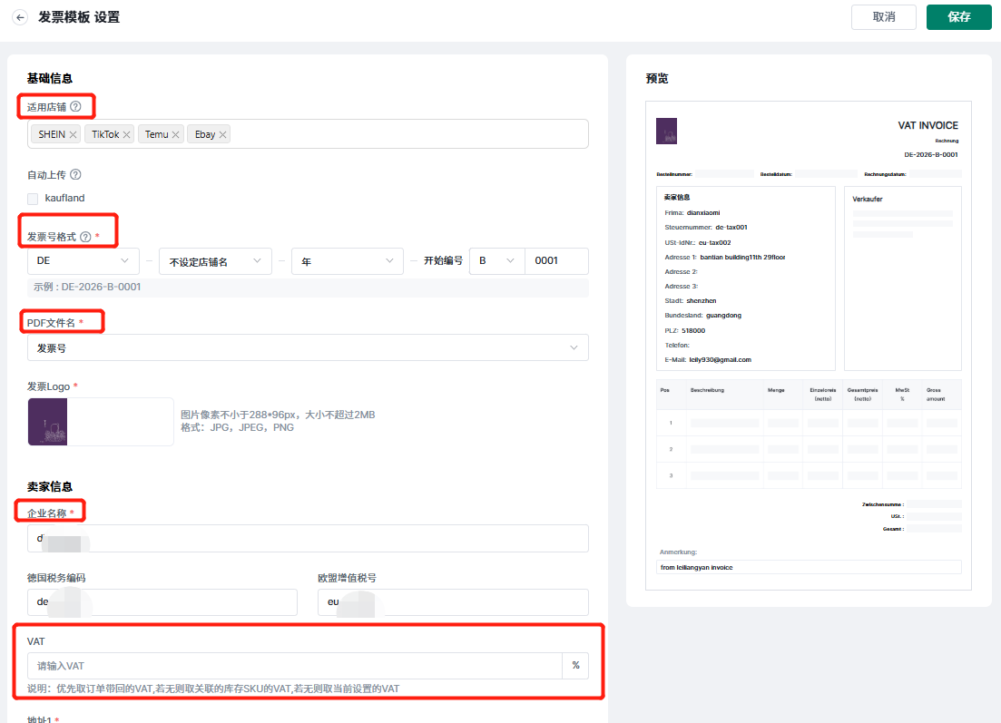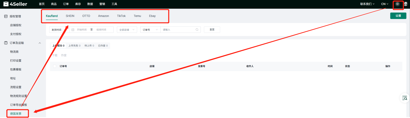 注意:若授权了Kaufland、SHEIN、Amazon、TEMU、eBay、OTTO、TikTok 德国站平台店铺至4Seller,设置界面则会出现 German Invoice入口。