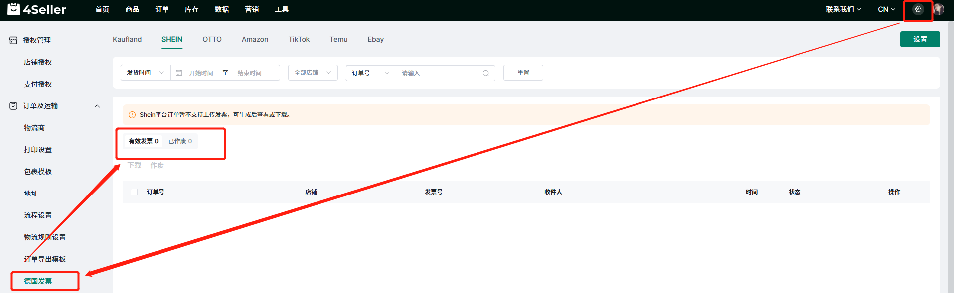 现4Seller支持设置Kaufland、SHEIN、Amazon、TEMU、eBay、OTTO、TikTok发票,其中Kaufland平台在发货时可自动上传发票,SHEIN平台支持生成发票后下载并打印。