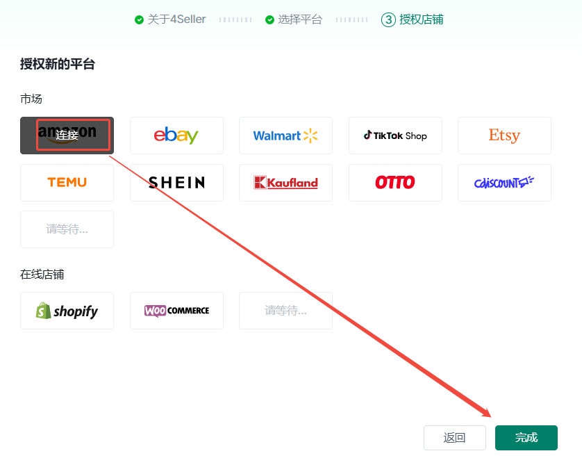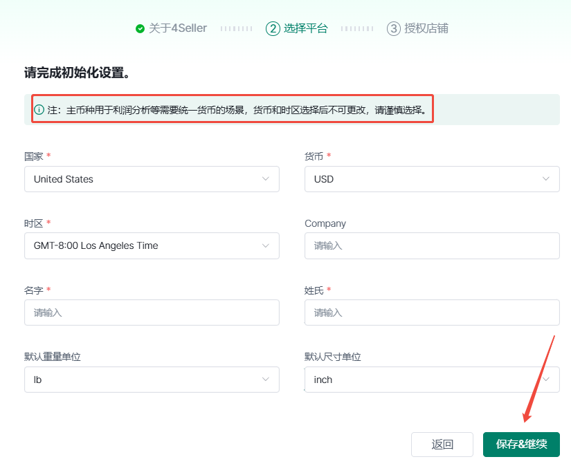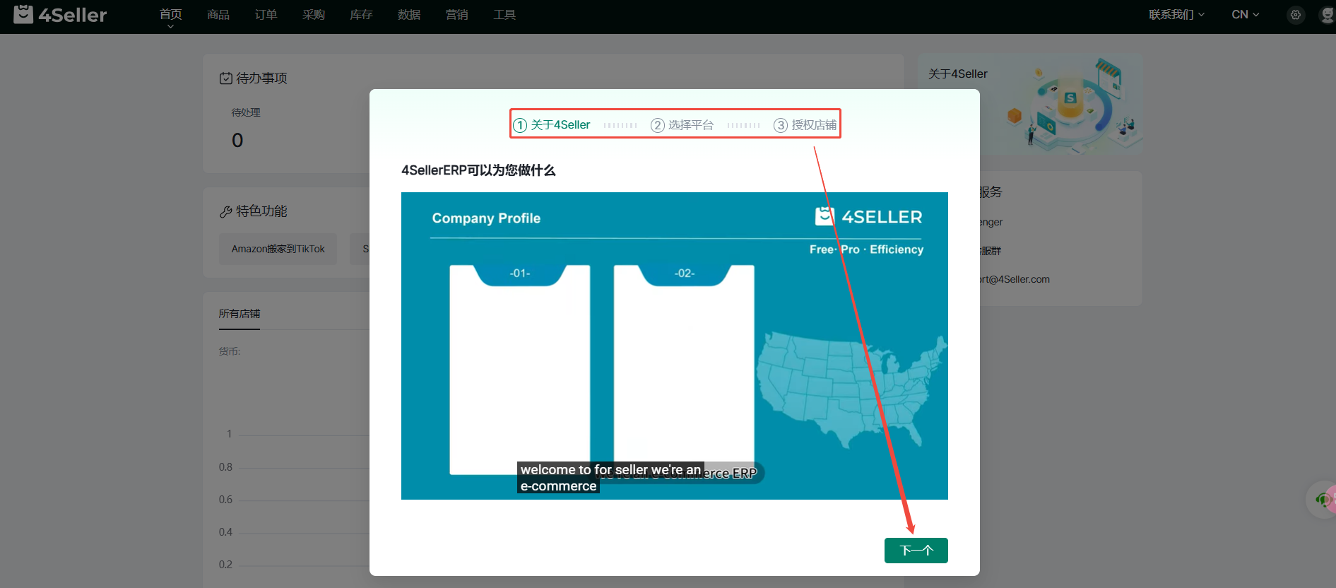 3、注册进入后观看4Seller简介视频后, 点击下一步。 4、填写必填信息,包括 国家、货币、时区、名字和姓氏 , 完成后点击保存&继续 5、选择您想要连接的电商平台标志,并点击连接,也可后续操作。 完成以上5个步骤后,您的4Seller帐户就已经设置成功。