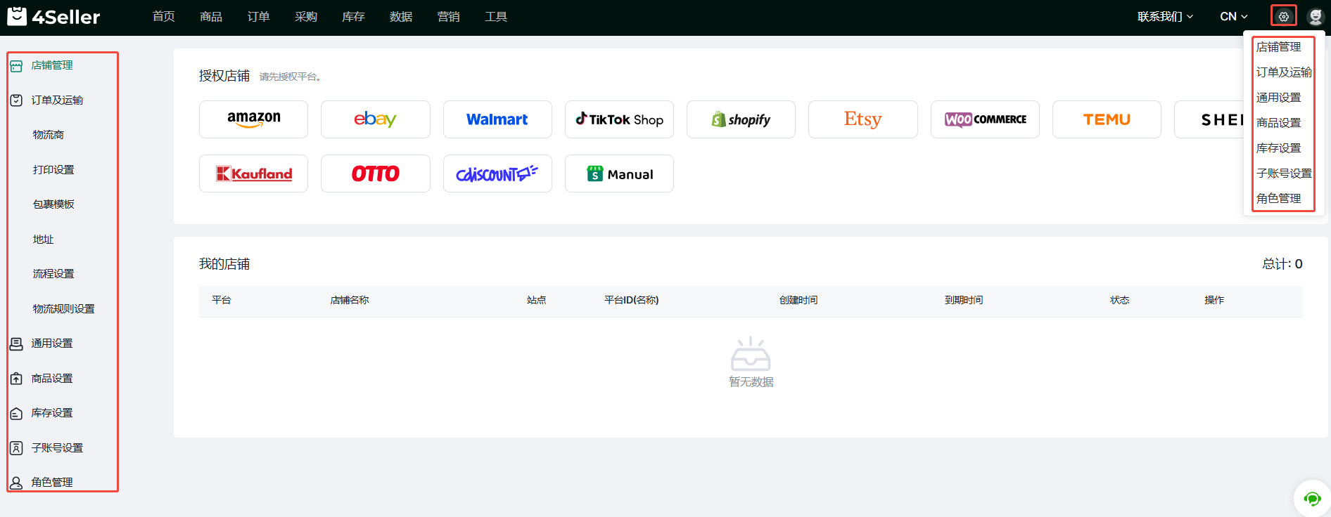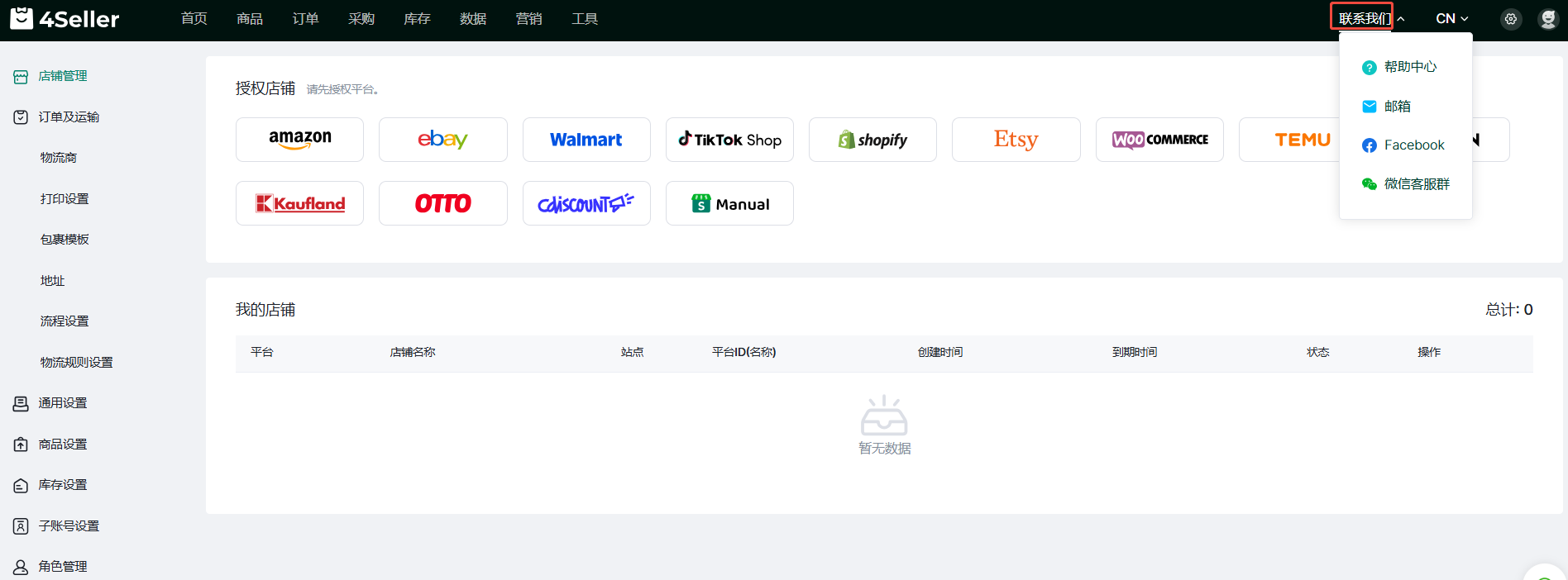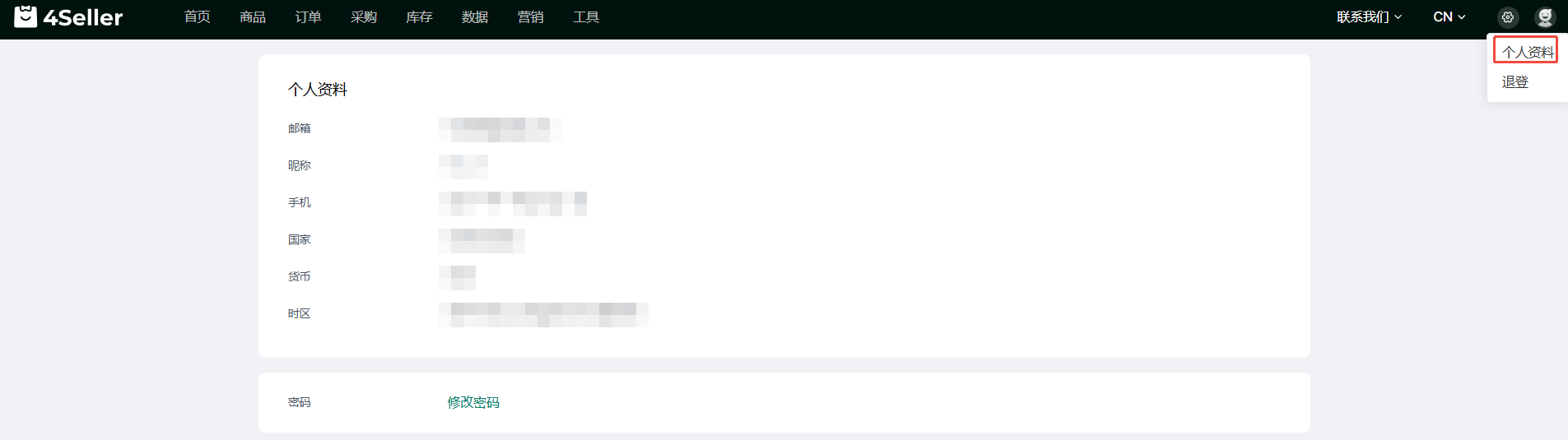 6、点击右上角个人资料可以获取相关信息(邮箱即4Seller账号),修改手机和密码