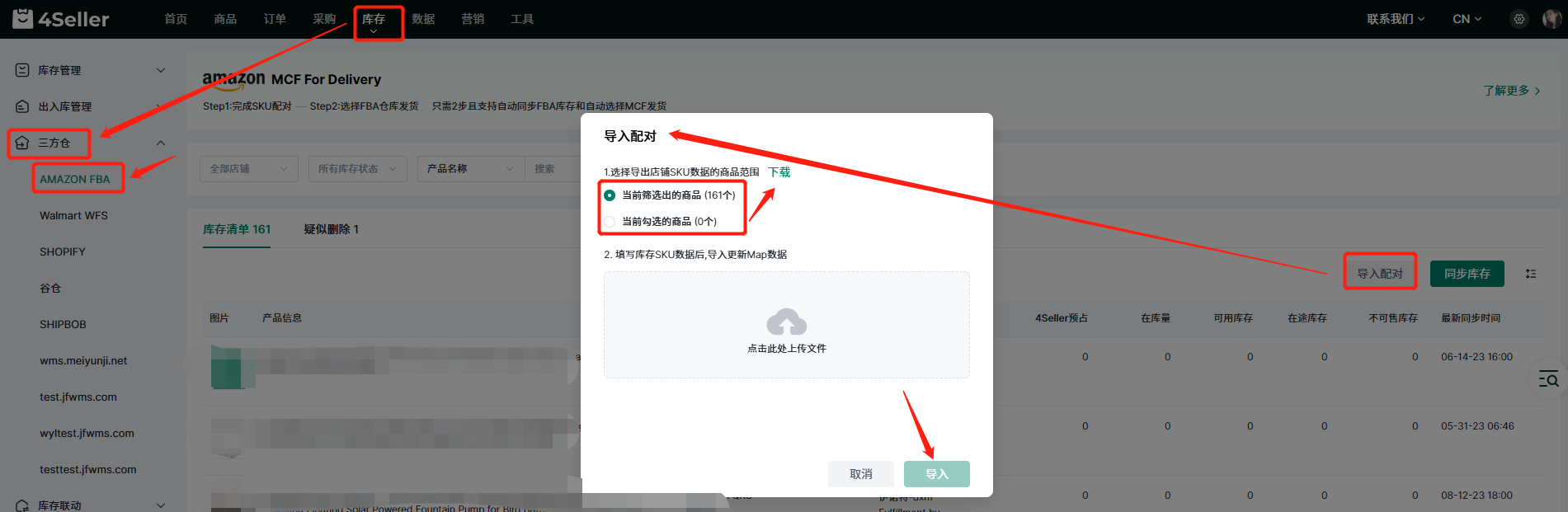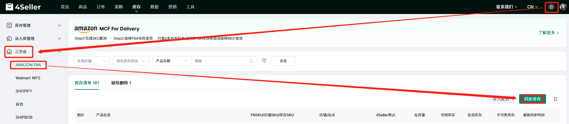 点击库存进入FBA页面,点击同步库存可将亚马逊的库存同步到4Seller,然后点击库存的SKU即可关联库存产品的SKU