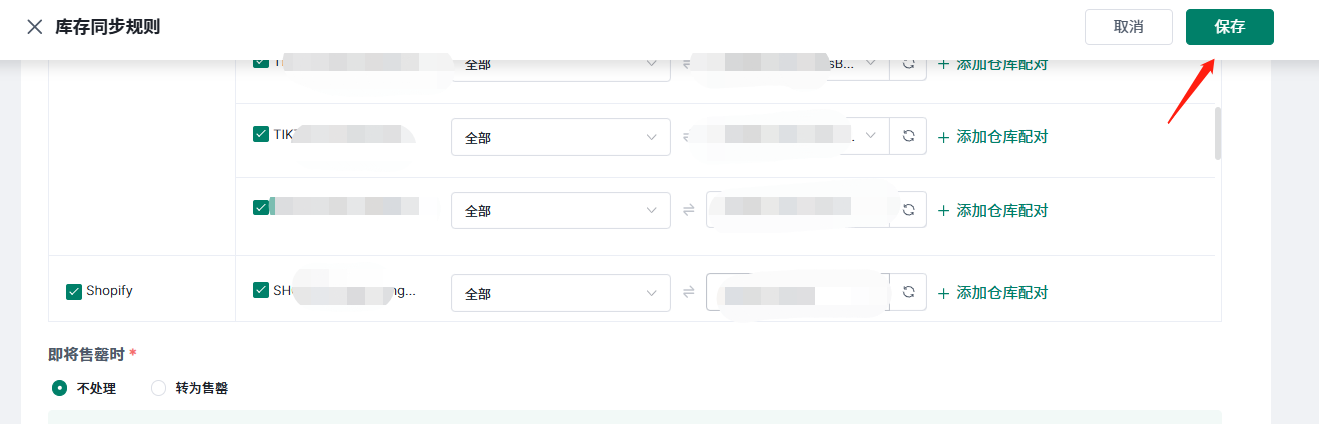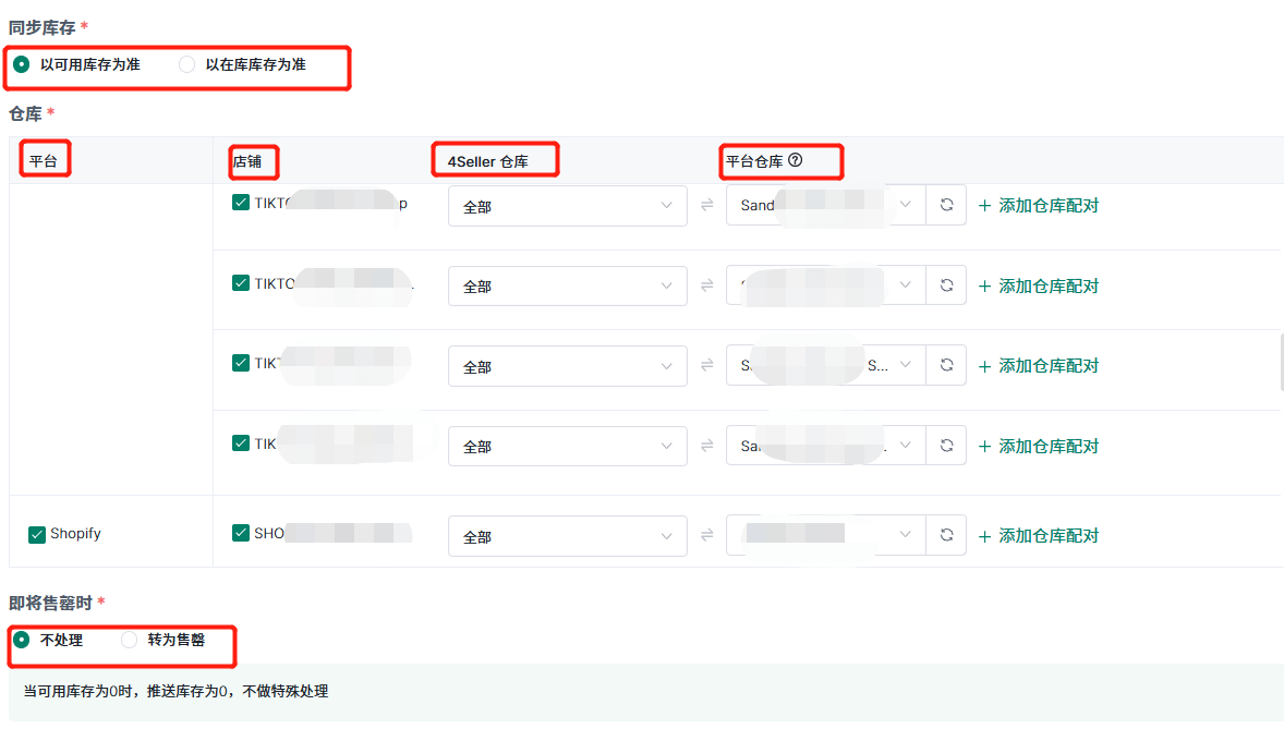 (3)可配对4Seller仓库与平台仓库(4Seller仓库可支持全部选择)3.设置即将售罄时的规则选项: