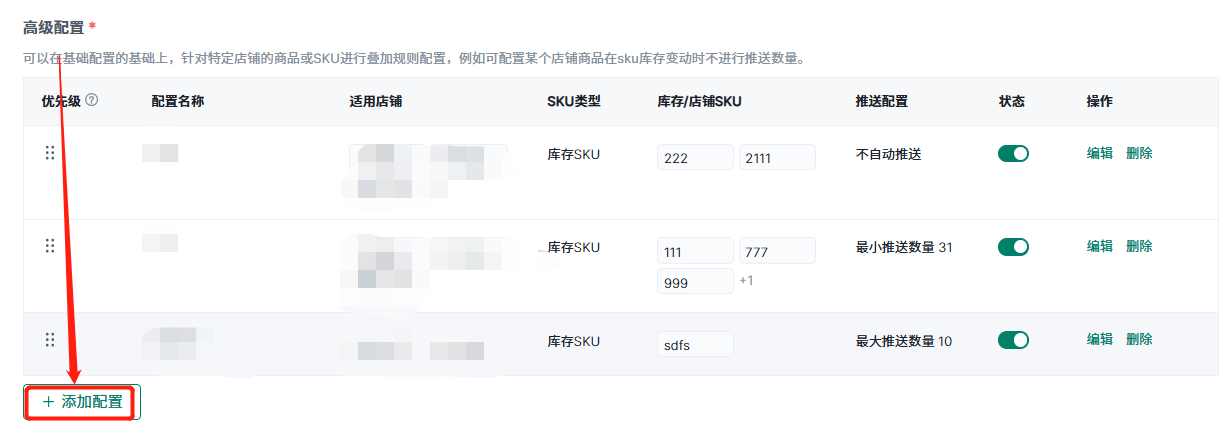 高级配置:可以在基础配置的基础上,针对特定店铺的商品或SKU进行叠加规则配置,例如可配置某个店铺商品在sku库存变动时不进行推送数量。