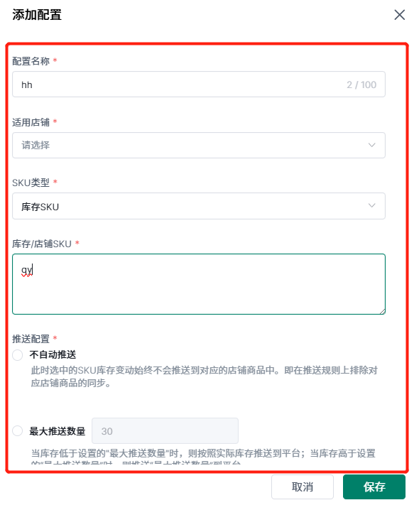 不自动推送:选中的SKU库存变动始终不会推送到对应的店铺商品中。即在推送规则上排除对应店铺商品的同步。
