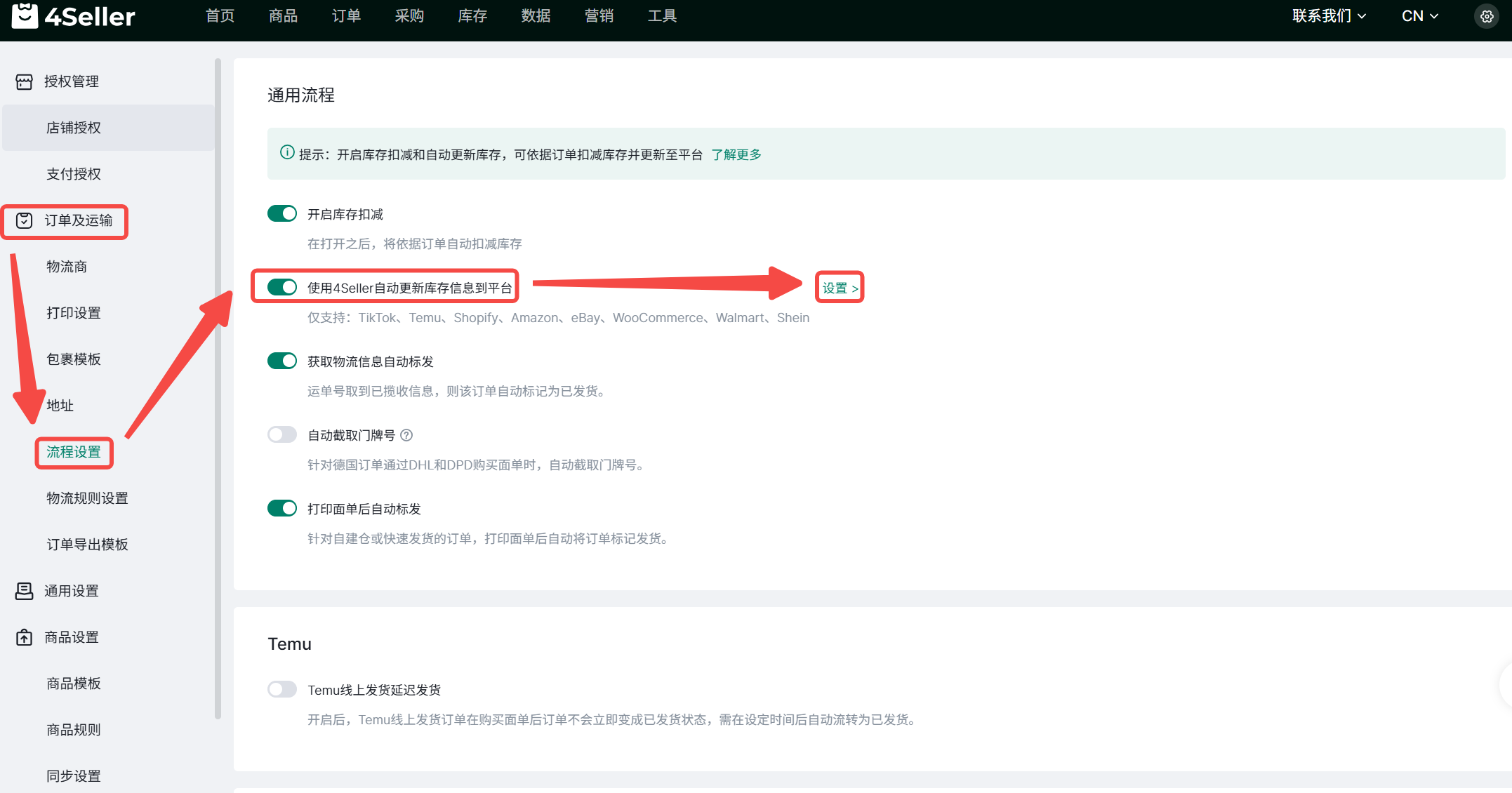 设置--商品设置--开启“使用4Seller自动更新库存信息到平台”