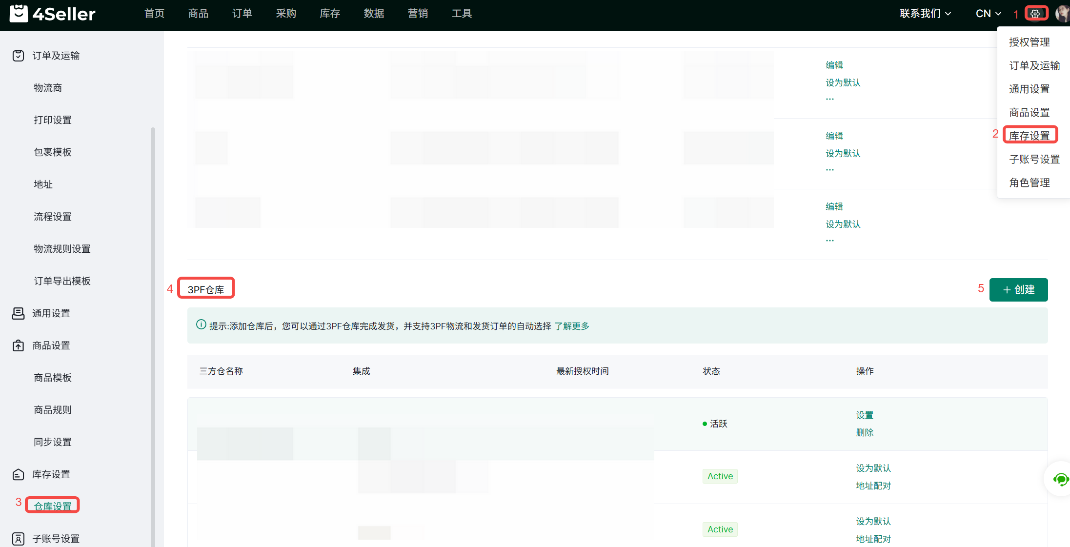 进入库存设置页面,找到3PF仓库,点击创建即可添加FBA仓库。
