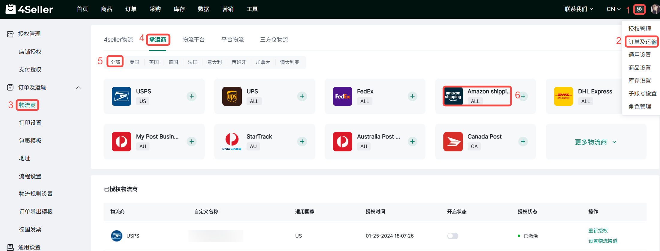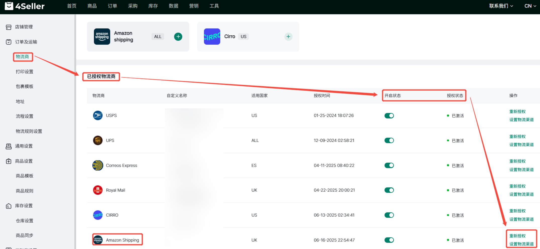4Seller支持对接Amazon Shipping 1、 设置-订单及运输-物流商-承运商-直营物流商-点击“+”号。 2、填写自定义名称,选择亚马逊店铺,点击连接即可自动将该亚马逊店铺的Amazon shipping账号授权到4Seller。 3、授权成功后可在下方已授权物流商中查看和设置状态,进行重新授权和设置物流渠道的操作。 4、点击设置物流渠道,可以勾选需要的物流服务,点击保存,可供后续订单购买面单时选择相应的物流渠道。