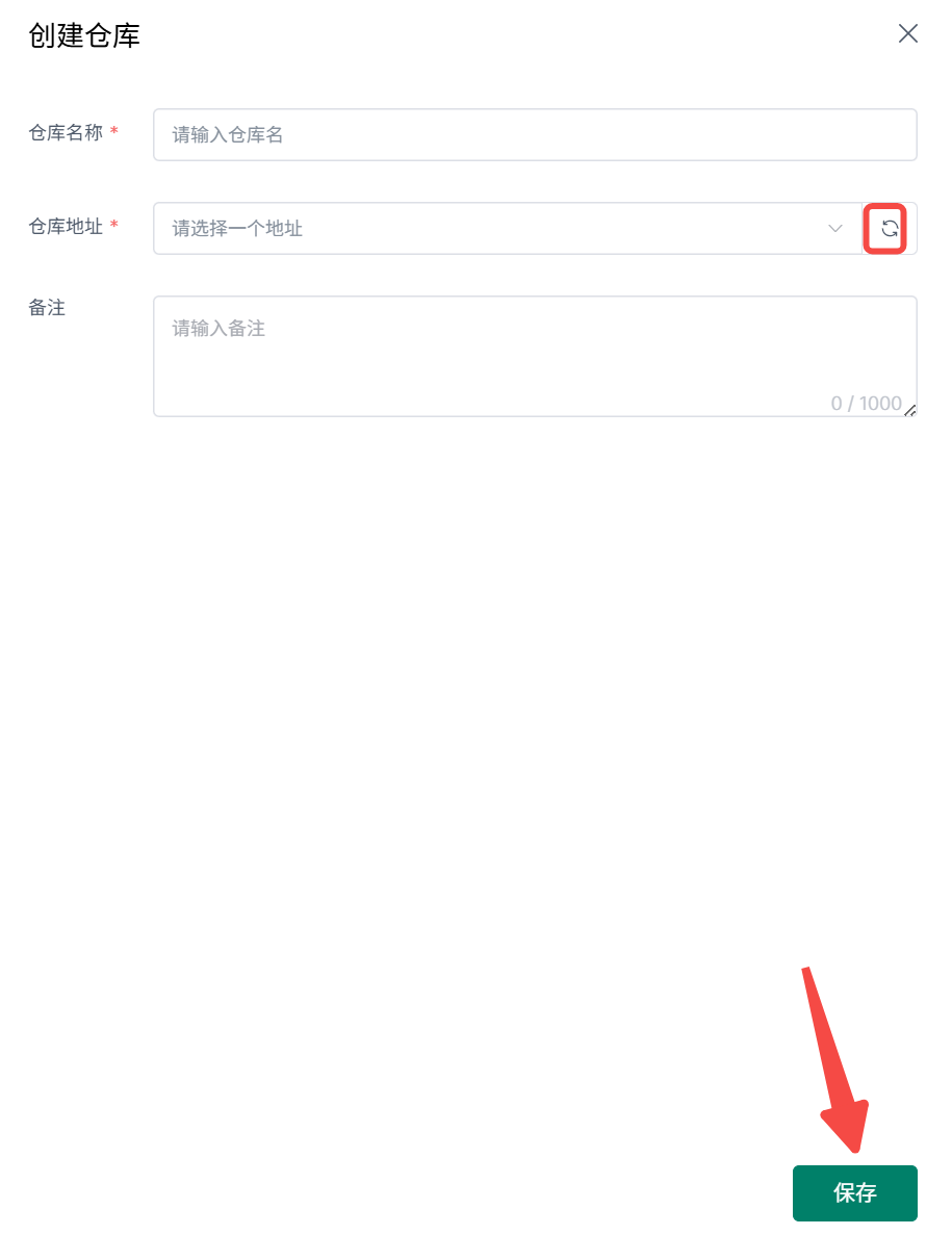 2、填写仓库名称、刷新并选择仓库地址、备注>保存