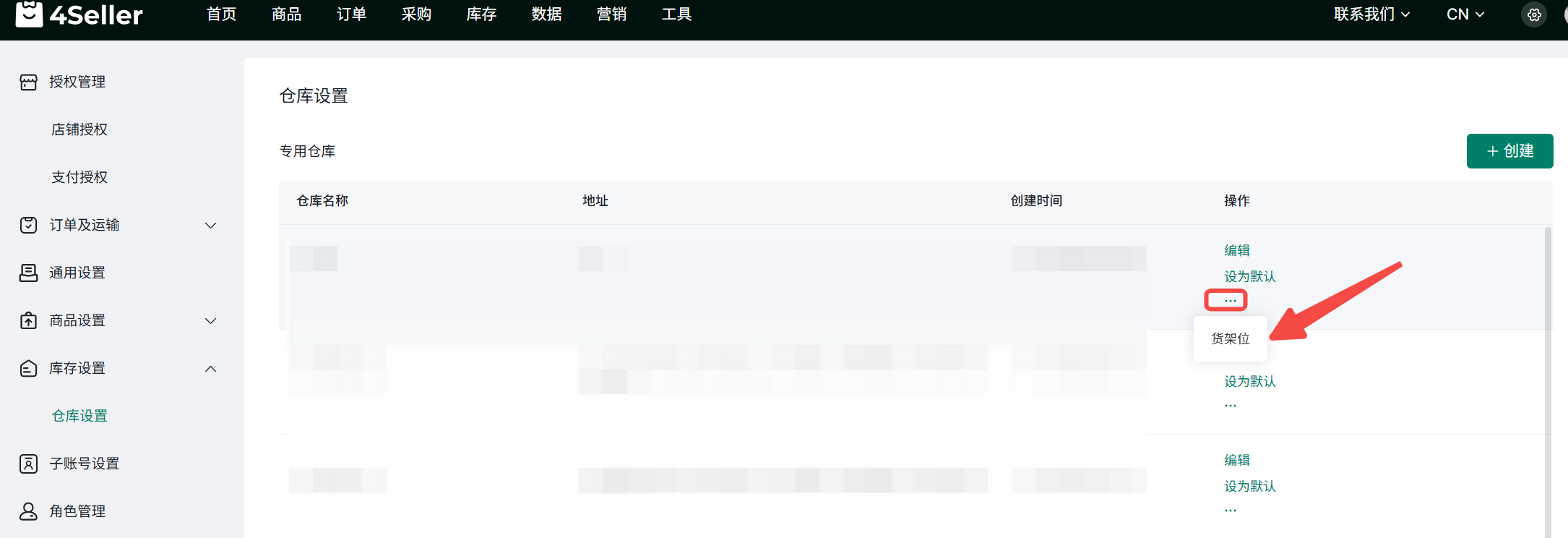 二、如何设置货架位?1、在相应的仓库一栏点击更多>货架位