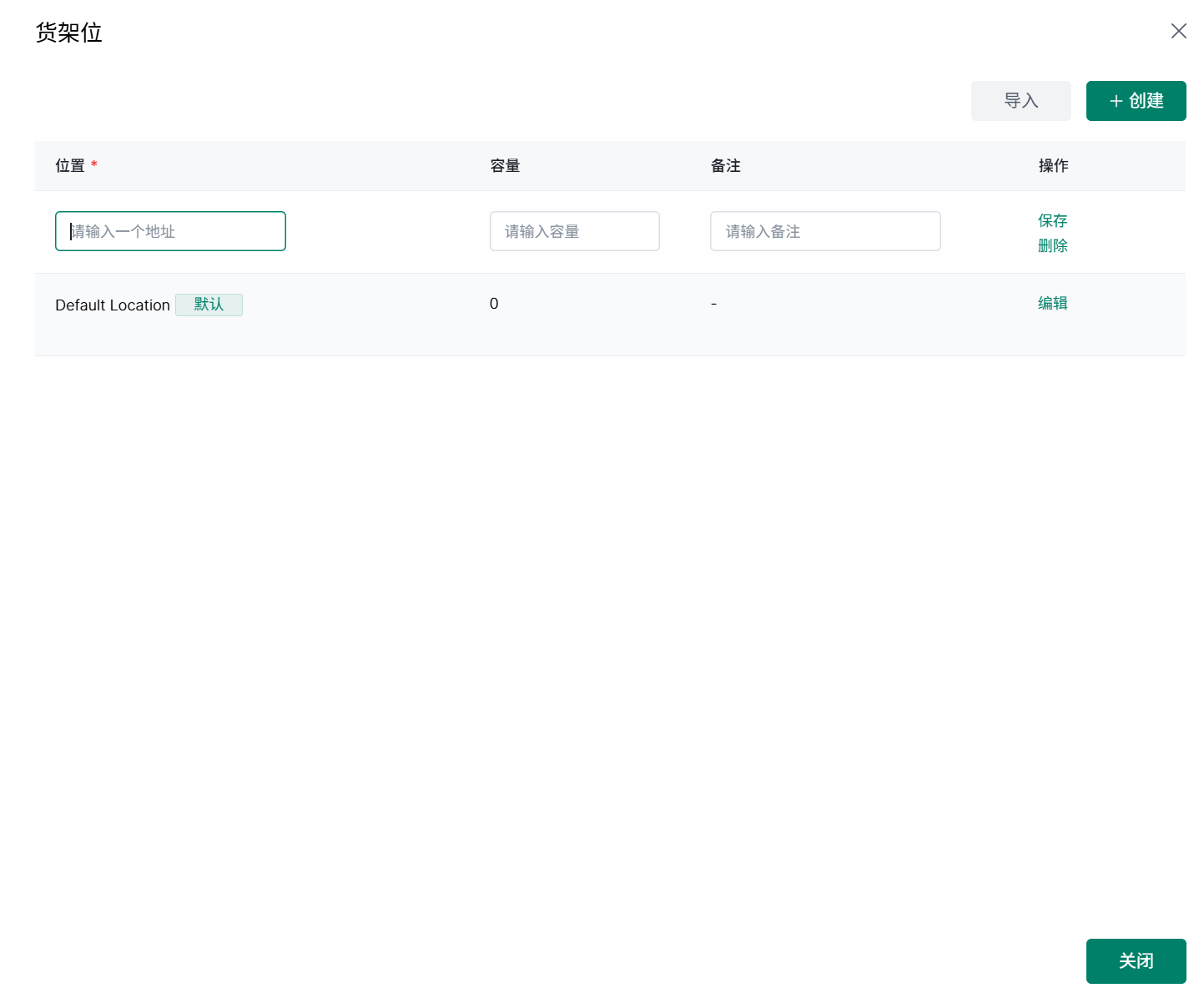 2、填写地址、容量及备注信息,可以单个创建,也可以点击导入下载模板批量导入