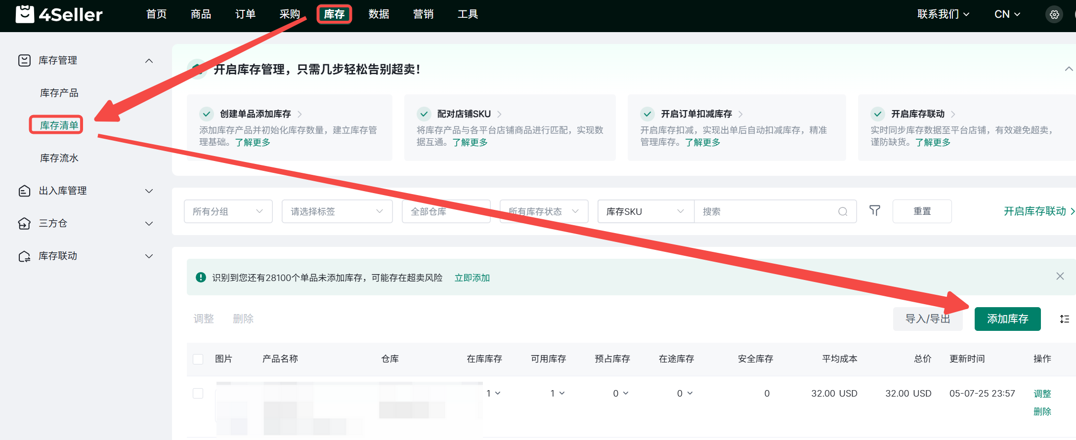 1、进入库存>库存清单>添加库存