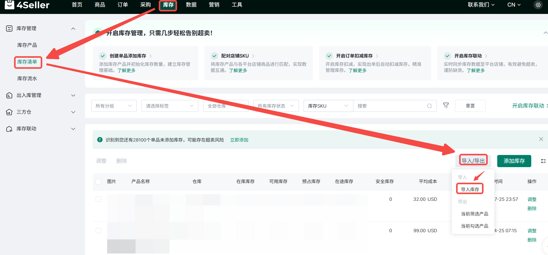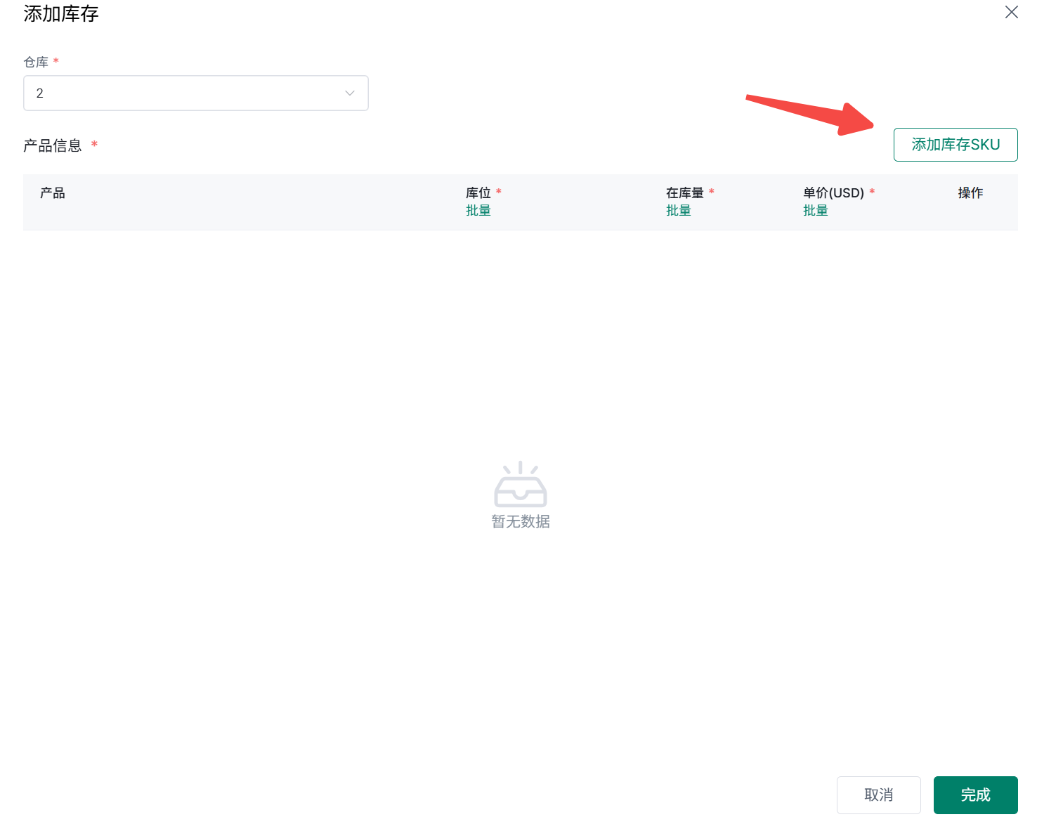 2、选择仓库>添加库存SKU